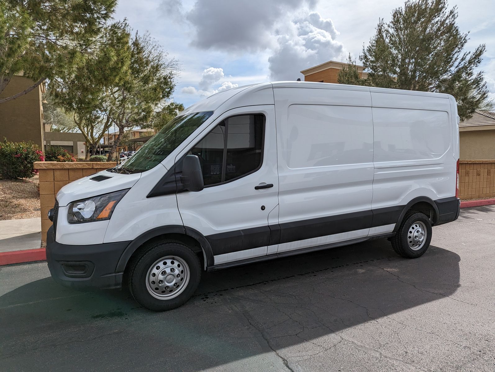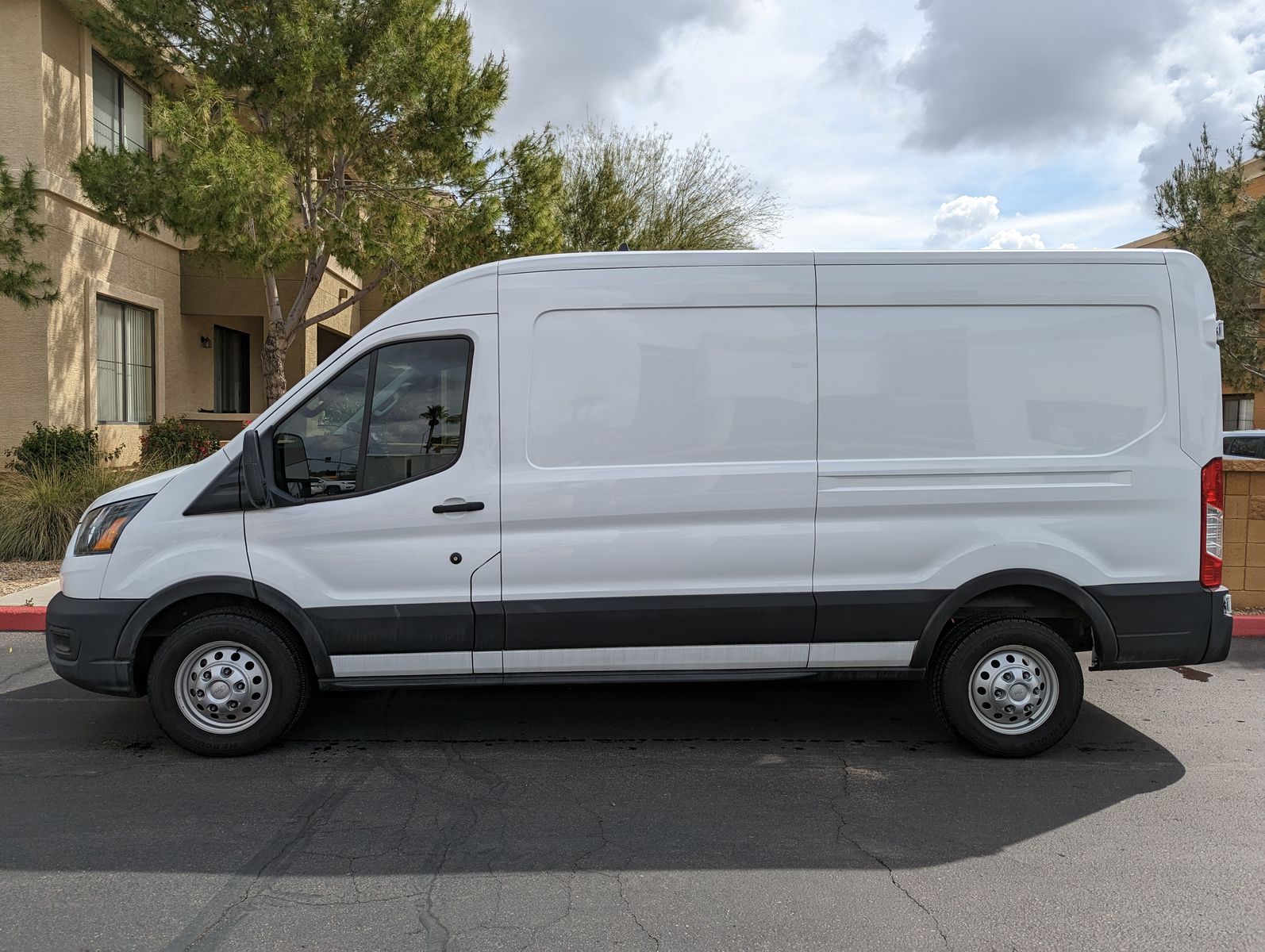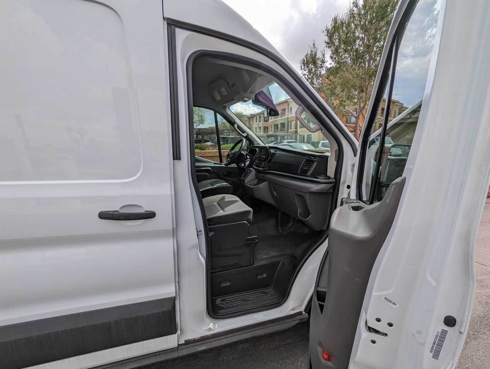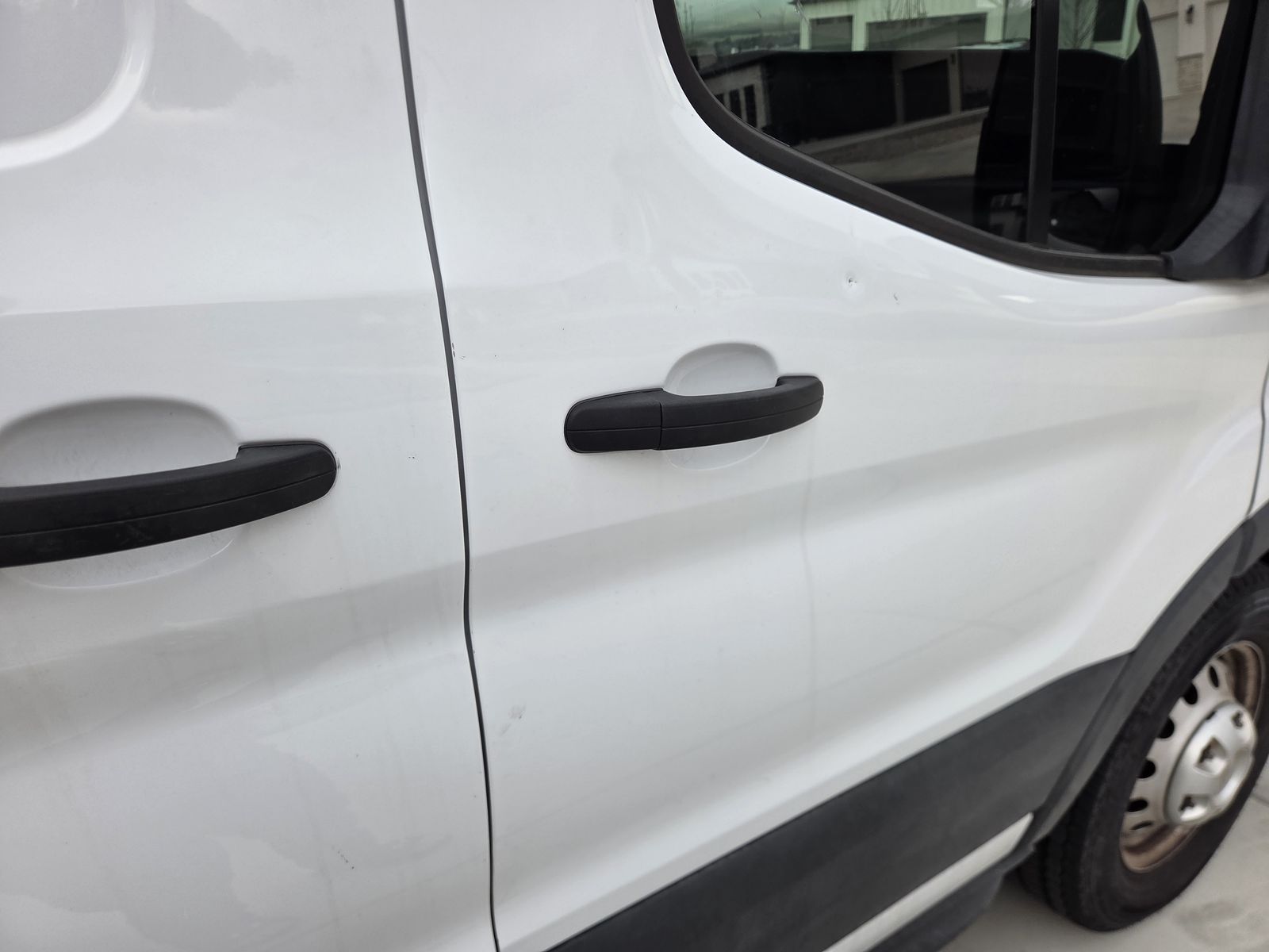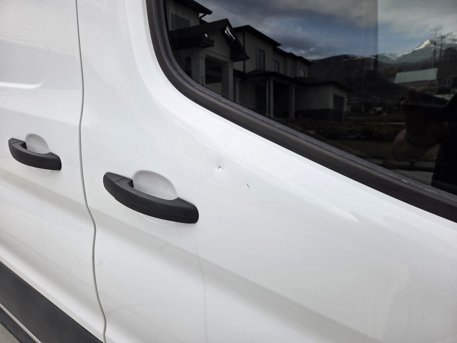 There is a small dent on the passenger side that is not very noticeable from a distance and would be an easy fix if desired. It would also be largely hidden if the van is wrapped for business branding.