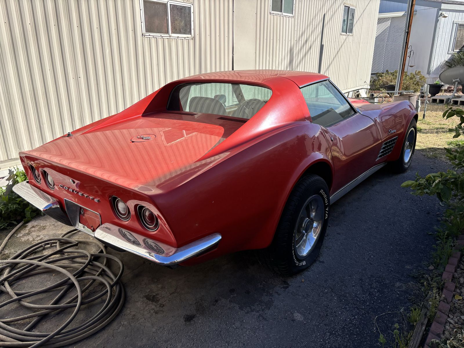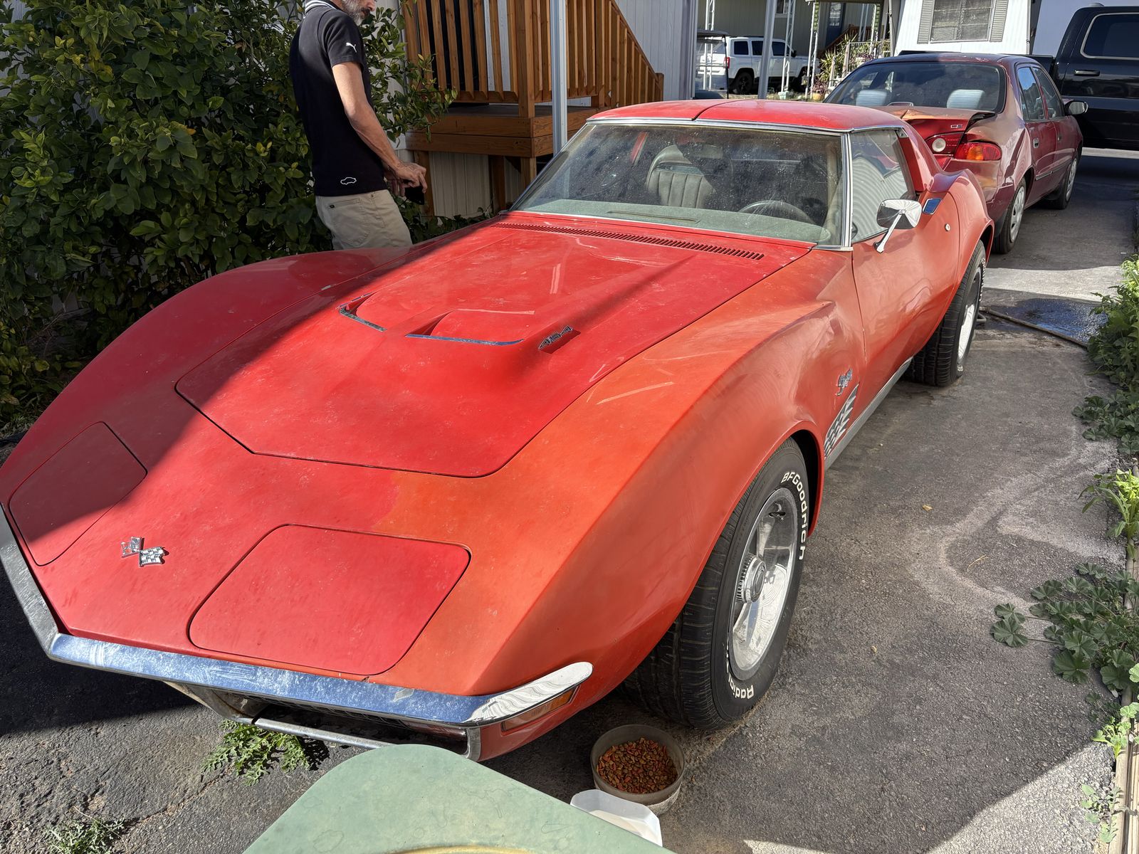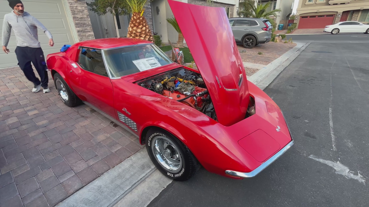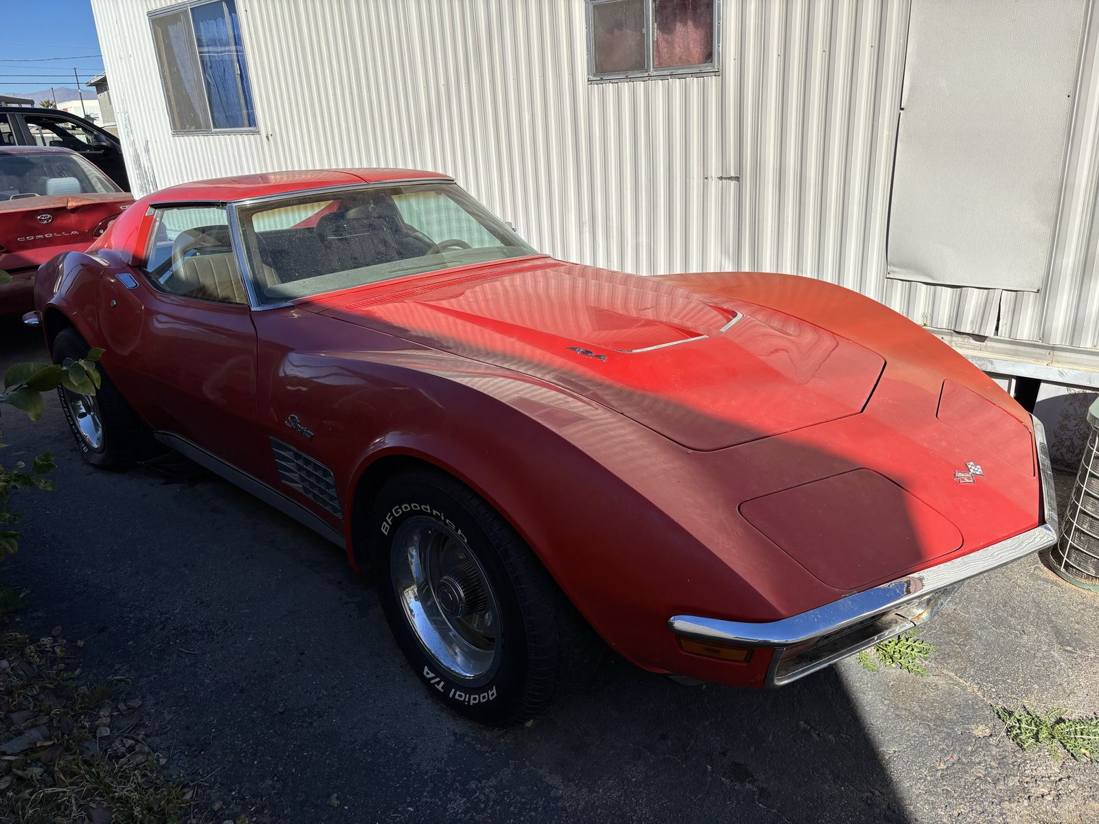 1972 corvette stingray. Factory red car with T-tops. Tan leather interior. original 454ci V8 paired with the original M-21 muncie four speed manual transmission. 411 rear end. A/C car. 4 wheel disc brakes. Power steering. Power windows. Excellent specimen of what it is. What you see is what you get no BS nothing to hide. No rust in the birdcage. No accidents. Few very minor stress cracks otherwise solid car. Now for the cons: needs tires. ( 7 0 2 ) 8 1 7 - 8 8 2 1 - Jake