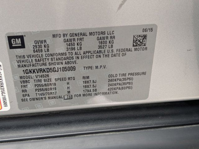 EBONY SEAT TRIM LEATHER-APPOINTED SEATING ON FIRST AND SECOND ROWS,RECLINING FRONT BUCKETS (STD),AUDIO SYSTEM COLOR TOUCH RADIO WITH INTELLILINK AM/FM/SiriusXM radio with CD player 6.5 diagonal touch-screen display USB port and auxiliary input jack (STD),WHEELS 4 - 19 X 7.5 (48.3 CM X 19.1 CM) ALUMINUM (STD),LICENSE PLATE BRACKET FRONT,TIRES P255/60R19 H-RATED BLACKWALL (STD),TRANSMISSION 6-SPEED AUTOMATIC (STD),SEATING 7-PASSENGER (2-2-3 SEATING CONFIGURATION) (Includes 2nd row flat-folding Captains Chair. May be substituted with (ABC) 8-passenger (2-3-3 seating configuration).) (STD),SLT-1 PREFERRED EQUIPMENT GROUP Includes Standard Equipment,ENGINE 3.6L SIDI V6 (281 hp [210 kW] @ 6300 rpm 266 lb-ft of torque @ 3400 rpm [359.1 N-m]) (STD),QUICKSILVER METALLIC,All Wheel Drive,Power Steering,ABS,4-Wheel Disc Brakes,Aluminum Wheels,Tires - Front All-Season,Tires - Rear All-Season,Temporary Spare Tire,Rear Spoiler,Automatic Headlights,Fog Lamps,Heated Mirrors,Power Mirror(s),Integrated Turn Signal Mirrors,Mirror Memory,Privacy Glass,Intermittent Wipers,Intermittent Wipers,Remote Trunk Release,Power Liftgate,AM/FM Stereo,CD Player,Satellite Radio,MP3 Capability,Bluetooth Connection,Auxiliary Audio Input,Requires Subscription,Premium Sound System,MP3 Capability,Auxiliary Audio Input,MP3 Capability,Auxiliary Audio Input,Rear Seat Audio Controls,Satellite Radio,Requires Subscription,Bucket Seats,3rd Row Seat,Bucket Seats,Rear Bucket Seats,Leather Seats,Heated Front Seat(s),Power Driver Seat,Driver Adjustable Lumbar,Power Passenger Seat,Heated Front Seat(s),Floor Mats,Steering Wheel Audio Controls,Leather Steering Wheel,Adjustable Steering Wheel,Power Windows,Power Door Locks,Keyless Entry,Power Door Locks,Remote Engine Start,Cruise Control,Universal Garage Door Opener,Immobilizer,Climate Control,Multi-Zone A/C,A/C,Rear A/C,A/C,Rear A/C,Rear Defrost,Auto-Dimming Rearview Mirror,Driver Vanity Mirror,Passenger Vanity Mirror,Driver Illuminated Vanity Mirror,Passenger Illuminated Visor Mirror,Front Reading Lamps,Rear Reading Lamps,Telematics,Navigation from Telematics,Requires Subscription,Telematics,WiFi Hotspot,Requires Subscription,Telematics,Smart Device Integration,Requires Subscription,Traction Control,Stability Control,Daytime Running Lights,Driver Air Bag,Passenger Air Bag,Front Side Air Bag,Front Head Air Bag,Rear Head Air Bag,Passenger Air Bag Sensor,Rear Parking Aid,Back-Up Camera,Child Safety Locks,Tire Pressure Monitor