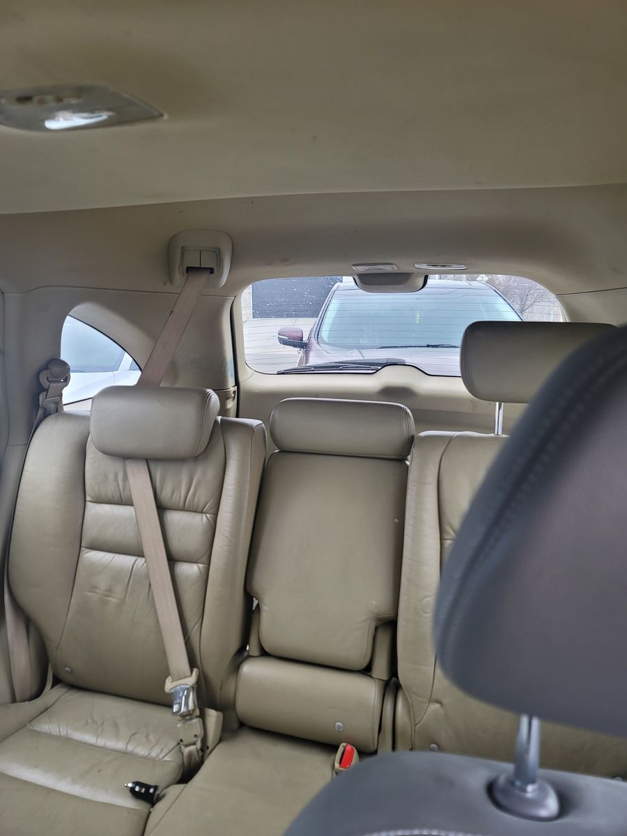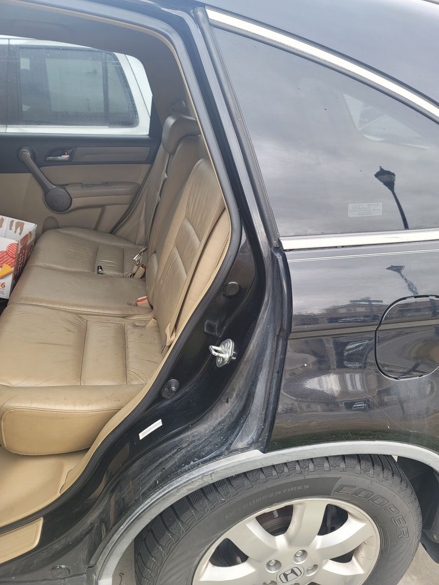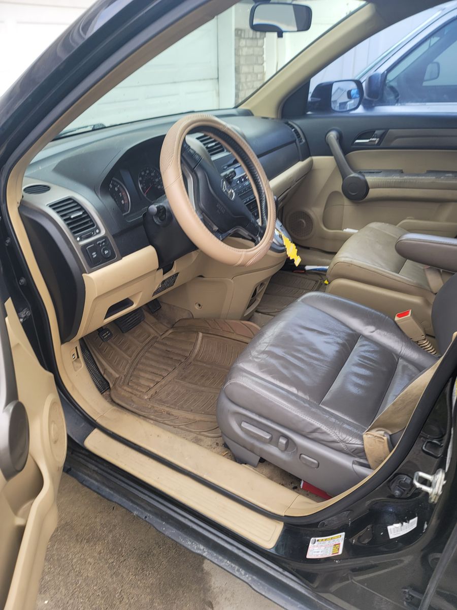 This is a reliable black 2008 Honda CRV, automatic transmission, with four doors, and it has low miles of 151,000 miles. The seats are leather tan and gray interior with heated seats in the front.