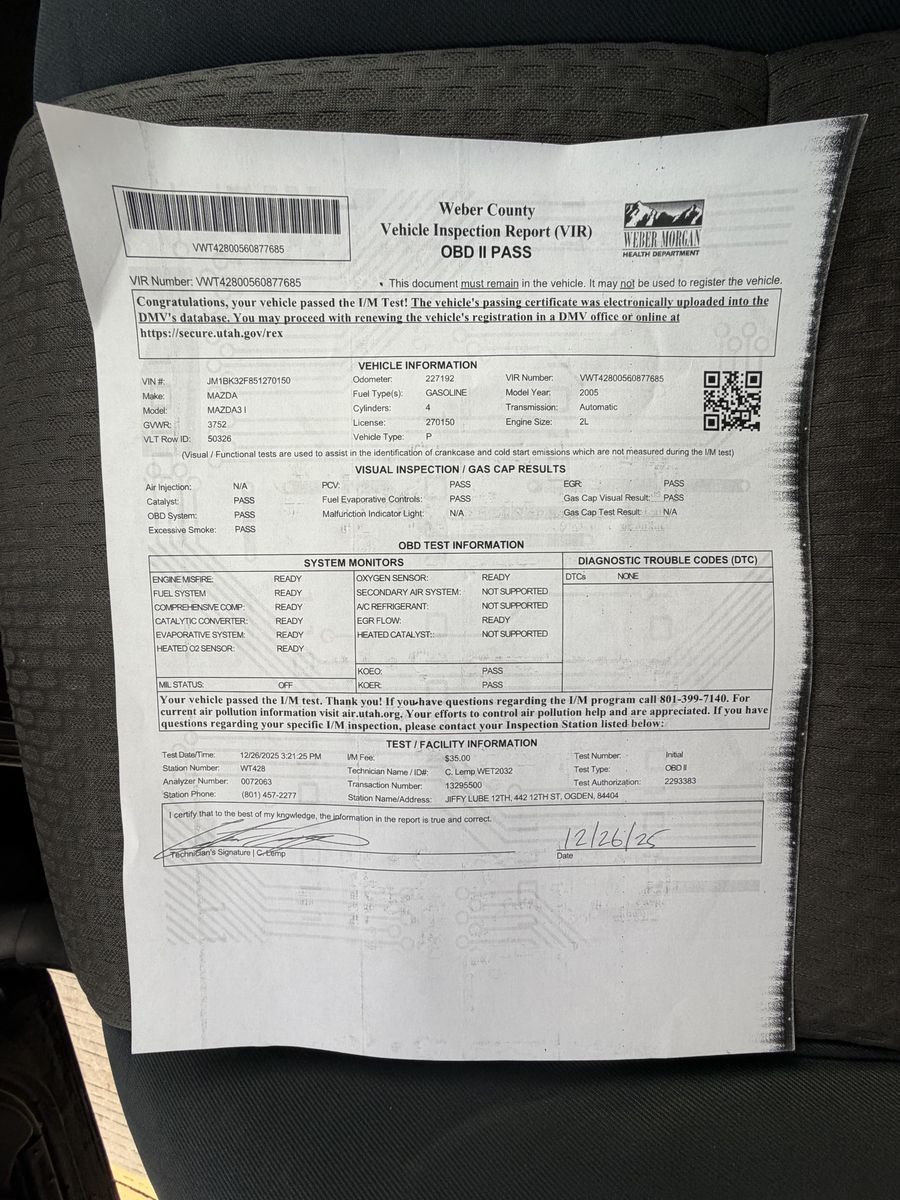 2005 Mazda 3 with a strong engine, no oil leaks, no engine codes, passed Utah emissions on 12-26-2025 (3 months ago - photo included).