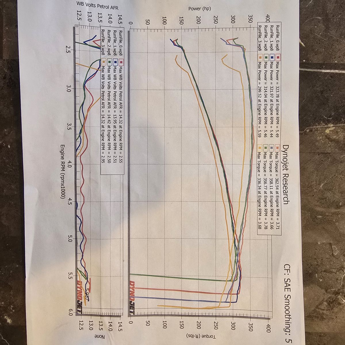 A V8 dyno'd at 323 hp @ 5.49 RPM and 362 torque @ 3.71 RPM.