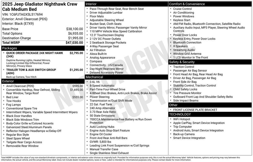 Check out our award winning dealership! 5-star google review, drive a little save a lot. Quick Order Package 24X Night Hawk (DISC) (110 MPH Vehicle Max Speed Calibration, Anti-Spin Differential Rear Axle, Body Color Fender Flares (2-Piece), Dana M210 Wide Front Axle, Dana M220 Wide Rear Axle, Daytime Running Lamp System, Deep Tint Sunscreen Windows, Mold In Color Bumper w/Gloss Black, Power Heated Mirrors, Protection Sill Rails, Sport Rear Shock Absorbers, Sport Suspension (DISC), and Wheels: 20'' x 8'' Painted Black Aluminum (DISC)), Trailer Tow & Aux Switch Group (Auxiliary Switches, Class IV Receiver Hitch, Heavy-Duty Engine Cooling, and Trailer Hitch Zoom), 12.3'' Touchscreen Display, 3.73 Rear Axle Ratio, 4-Wheel Disc Brakes, 4G LTE Wi-Fi Hot Spot, 8 Speakers, ABS brakes, Air Conditioning, Alexa Built-In, AM/FM radio: SiriusXM, Apple CarPlay, Apple CarPlay/Android Auto, Black 3-Piece Hard Top, Brake assist, Cloth Low-Back Bucket Seats, Compass, Connectivity - US/Canada, Delay-off headlights, Driver door bin, Driver vanity mirror, Dual front impact airbags, Dual front side impact airbags, Electronic Stability Control, Freedom Panel Storage Bag, Front anti-roll bar, Front Bucket Seats, Front Center Armrest w/Storage, Front fog lights, Front License Plate Bracket, Front reading lights, Google Android Auto, Illuminated entry, Integrated roll-over protection, Low tire pressure warning, Manufacturer's Statement of Origin, MOPAR Spray In Bedliner, Normal Duty Suspension, Occupant sensing airbag, Outside temperature display, Overhead airbag, Panic alarm, ParkView Rear Back-Up Camera, Passenger door bin, Passenger vanity mirror, Power steering, Power windows, Radio data system, Radio: Uconnect 5 w/12.3'' Display, Rear anti-roll bar, Rear reading lights, Rear Sliding Window, Rear Window Defroster, Remote keyless entry, Speed control, Split folding rear seat, Steering wheel mounted audio controls, Tachometer, Telescoping steering wheel, Tilt steering wheel, Traction control, Trip computer, USB Host Flip, Variably intermittent wipers, Voltmeter, and Wheels: 17'' x 7.5'' Black Steel Styled Sale Price Includes $1,000 Finance Savings. Contact Dealer For Details.
