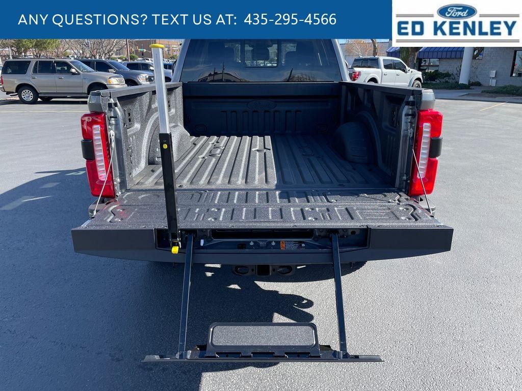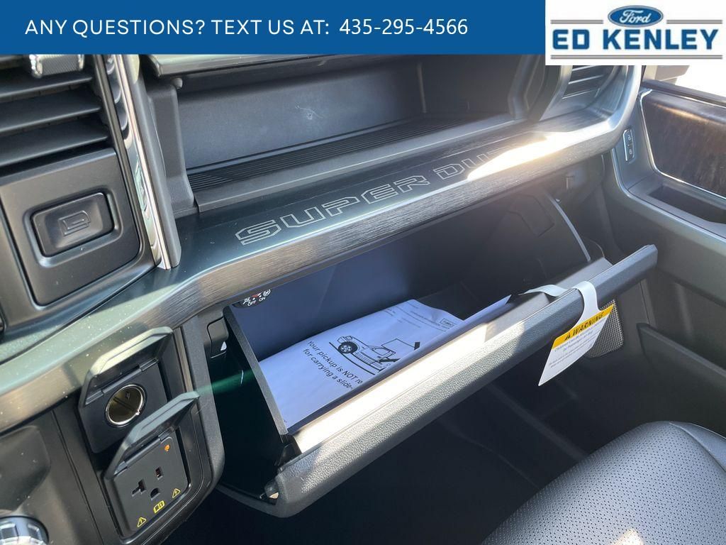 Black Appearance Package: Rear Wheel Well Liners; Black Painted Front Grille Surround; Ebony Black Painted Mirror Caps; Tough Bed Spray-In Bedliner; Body Color Front and Rear Bumpers; 6" Ebony Black Angular Running Boards,Lariat Premium Package,Ford Co-Pilot 360 Assist 2.0: Pre-Collision Assist; Post-Collision Braking; BLIS with Cross-Traffic Alert; Lane-Keeping System; Front and Rear Parking Sensors; Automatic High Beam; Adaptive Cruise Control with Stop-And-Go,FX4 Off-Road Package: Transfer Case and Fuel Tank Skid Plates; Hill Descent Control; Off-Road Specifically Tuned Shock Absorbers; Unique FX4 Off-Road Box Decal,Order Code 618A: 18" Bright Machined and Carbonized Gray Aluminum Wheels; LT275/65Rx18E BSW A/S Tires; B&O Sound System by Bang and Olufsen,Twin Panel Power Moonroof,Pro Power Onboard - 2kW,5th Wheel/gooseneck Hitch Prep Package,Onboard Scales and Smart Hitch,Tough Bed Spray-In Bedliner,Super Duty Tool Kit by AllTrade,Power-Sliding Rear-Window with Defrost,SecuriCode Keyless Entry Keypad (driver's Side),Electronic-Locking with 3.55 Axle Ratio,Tailgate Step and Handle,Snow Plow Prep Package,Rapid-Heat Supplemental Cab Heater,Upfitter Switches (6),Rear Wheel Well Liners,LED Roof Clearance Lights,Lane Centering hands-on cruise control,5G Modem - Ford Connectivity Package mobile hotspot internet access,Reverse Camera rear mounted camera,Lane-Keeping System,Reverse Brake Assist collision mitigation,Adaptive Cruise Control with Stop-and-Go,Brake assist system,Cruise control with steering wheel mounted controls,Ventilated driver and front passenger seats,Connected Navigation integrated navigation system with voice activation,Keyfob remote start,Heated steering wheel,Heated driver and front passenger seats,ActiveX leather front seat upholstery,Primary monitor touchscreen,First and second-row sliding and tilting glass sunroof with express open/close activation sunshade,Driver seat power reclining, lumbar support, cushion tilt, fore/aft control and height adjustable control,Part-time 4WD,Powerstroke 6.7L V-8 diesel direct injection, intercooled turbo, diesel, engine with 500HP,Powerstroke 6.7L V-8,Front wireless smart device charging,SYNC 4 with Enhanced Voice Recognition (Alexa-Built-In) built-in virtual assistant,PCA with AEB and Intersection Assist forward collision mitigation with left turn assist,Driver Alert,Speed Sign Recognition,SecuriCode external keypad door lock control,Intelligent Access with hands-free access and push button start,Aerial view camera,Smart device remote start,Push-button,Onboard scale,Weight capacity alert,Bluetooth wireless audio streaming,Pro Trailer Backup Assist vehicle and trailer reverse assist,Pro Trailer Hitch Assist automated vehicle to trailer hitching assist,Gauge cluster display size: 12.00,Front mounted camera,Right side camera,Pickup box camera,Left side camera,BLIS with Trailer Tow Coverage blind spot warning,Pedestrian detection warning,Dual-zone front climate control,SYNC 4 with Enhanced Voice Recognition voice-activated climate control,Auto High Beam auto high-beam headlights,SecuriLock immobilizer,B&O Sound System by Bang & Olufsen speakers,SiriusXM Traffic real-time traffic,TV receiver/streaming,SYNC 4 handsfree wireless device connectivity