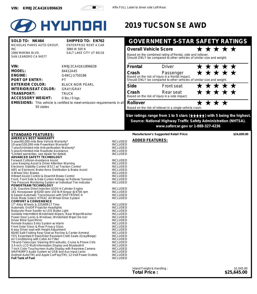The 2019 Hyundai Tucson SE AWD- with its striking Black Noir Pearl exterior- exudes a bold and sophisticated presence that captures attention on any road. This compact SUV is designed to combine style with practicality- ensuring you stand out while relishing in the robust performance it offers. Under the hood- the Tucson houses a 2.0L 4-cylinder engine- providing a balanced mix of power and efficiency- making it perfect for both city commutes and weekend adventures.