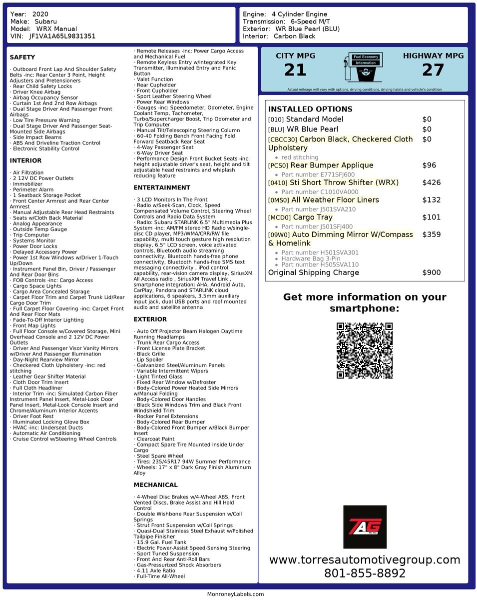 Draped in the iconic WR Blue Pearl- this stunning vehicle stands out not only for its vibrant exterior but also for its remarkable engineering. Nestled under the hood- the 2.0L 4-cylinder engine delivers a punchy drive- perfectly complemented by its manual transmission that places full control at your fingertips.