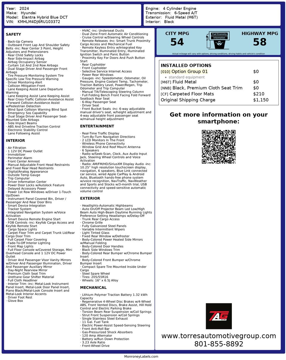 The thoughtful interior design is complemented by practical features such as carpeted floor mats- ensuring both comfort and cleanliness throughout your journeys. With the Blue DCT style- drivers can expect a seamless- dynamic driving experience that maximizes both power and fuel efficiency. Additionally- option group 01 provides a suite of enhancements- delivering greater convenience and advanced features tailored to meet the needs of modern drivers. The Elantra Hybrid isn’t just about efficient transportation; it’s about offering an elevated driving experience.