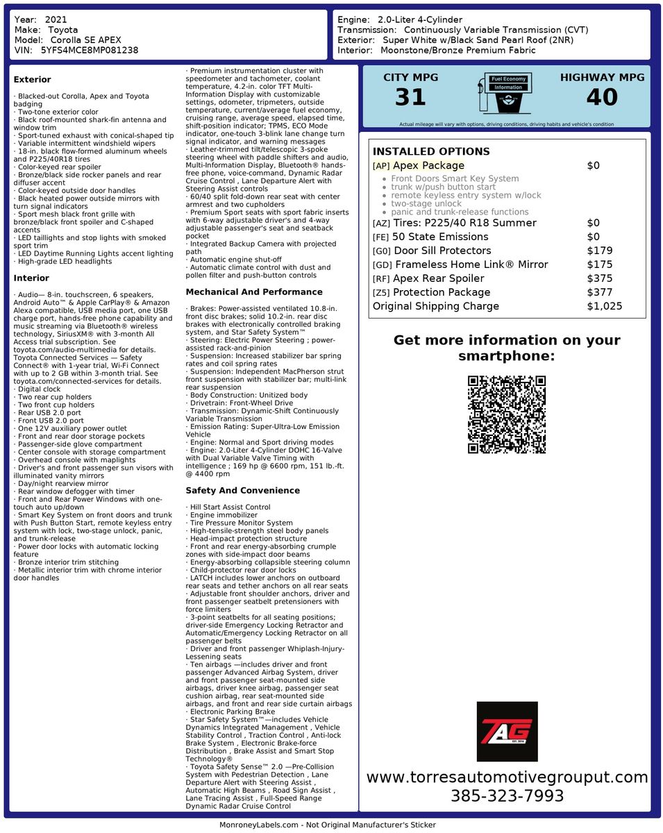 The 2021 Toyota Corolla APEX SE CVT (Natl) is a distinctive blend of style- performance- and practicality- reflecting a contemporary twist on a classic model. The exterior stands out with its striking Super White finish- enhanced by a contrasting Black Sand Pearl Roof- providing a sophisticated yet sporty appearance. This model is further enhanced by a sleek rear spoiler- adding an aerodynamic feature that complements its design.