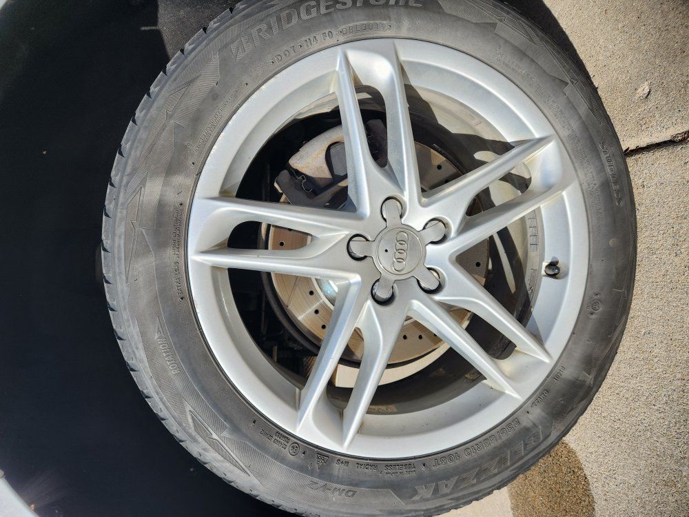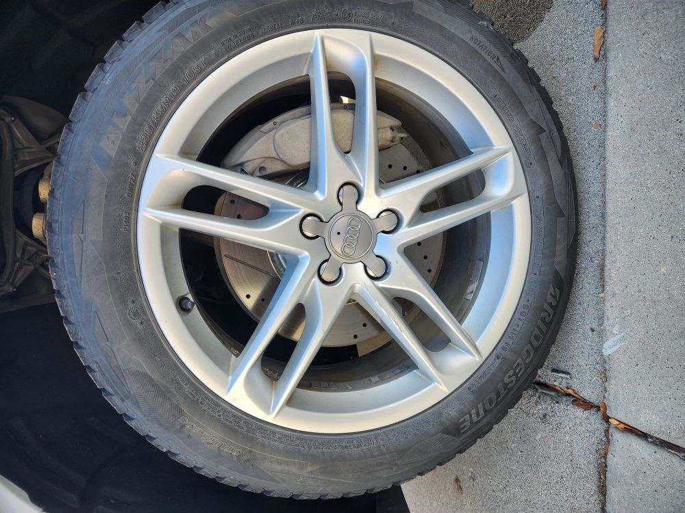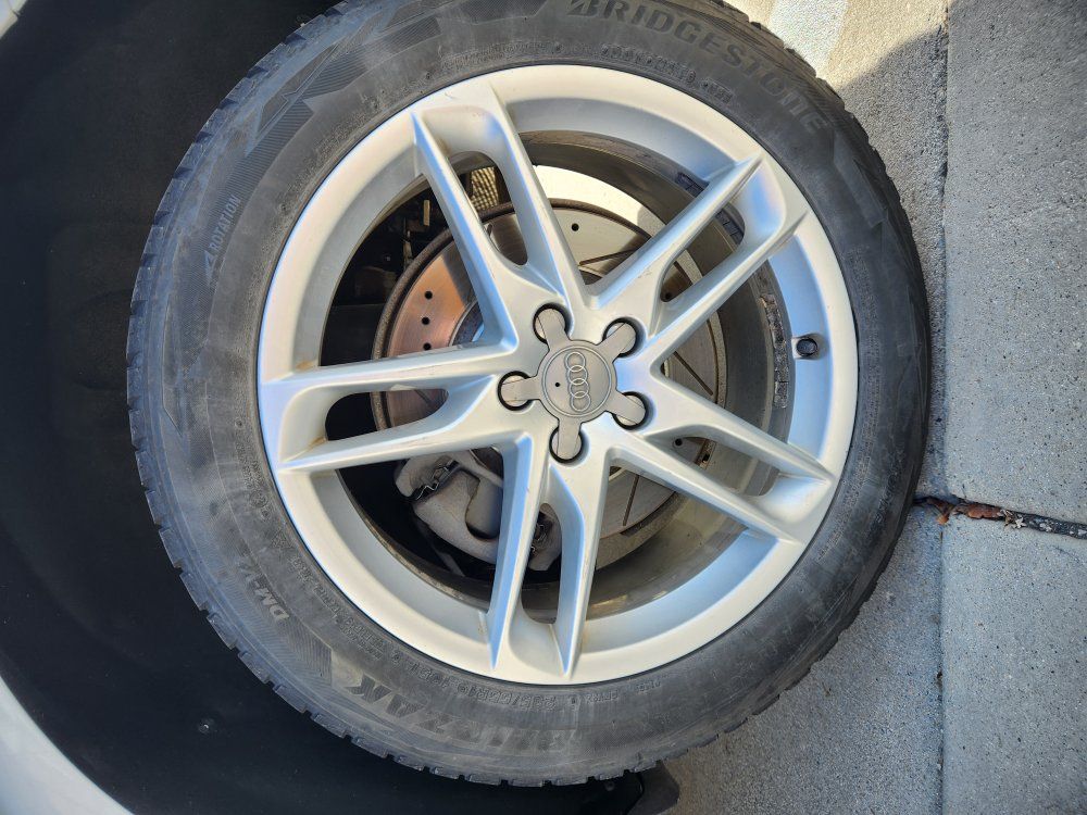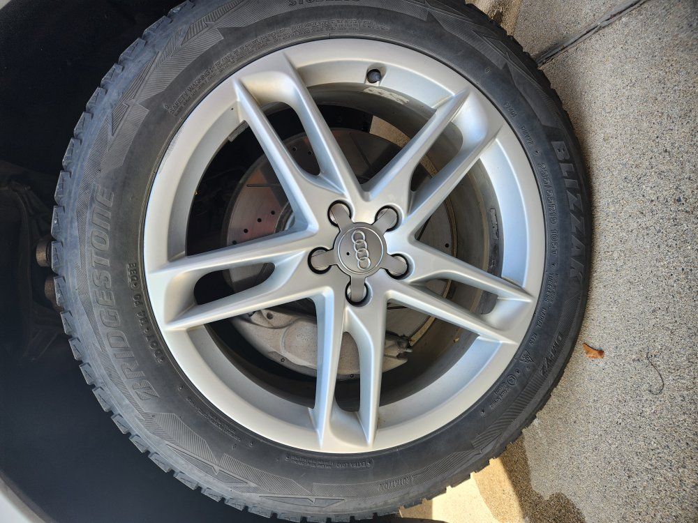 A set of 19" OEM Audi alloy wheels with center caps, mounted with Bridgestone Blizzak winter tires near end of life (some uneven wear).