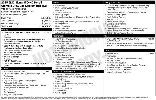 Take your drives to the next level with this GMC Sierra 3500HD from Salt Lake Valley Buick GMC! Engineered for a smooth ride, advanced convenience, and lasting dependability, this vehicle is ready to handle everything your day throws at you. Plus, enjoy a $1,000 finance savings, already included in the sale price, when you finance through one of our trusted lending partners. Looking for quality used cars in Salt Lake City? This GMC Sierra 3500HD delivers style, versatility, and value - perfect for daily commutes, family trips, or weekend adventures. Stop by Salt Lake Valley Buick GMC to see this vehicle in person and explore our wide selection of pre-owned cars, trucks, and SUVs. Browse online at www.slvbuickgmc.com or call 801-265-1511 to schedule your test drive today! With Gooseneck/5th Wheel Prep Package, Preferred Equipment Group 5SB (120-Volt Bed Mounted Power Outlet, 120-Volt Instrument Panel Power Outlet, 2 Charge-Only Rear USB Ports, 2 Charge/Data USB Ports Inside Center Console, 2 USB Ports, 2-Speed Active Transfer Case, Bed View Camera w/2 Trailer Camera Provisions, Bose Premium Series 12-Speaker System, Deep-Tinted Glass, Electric Rear-Window Defogger, Floor-Mounted Center Console, Front Rain-Sensing Wipers, HD Surround Vision, Heated 2nd Row Outboard Seats, Heated Driver & Front Outboard Passenger Seats, Hitch Guidance w/Hitch View, In-Vehicle Trailering App, Keyless Open & Start, LED Cargo Area Lighting, LED Smoked Amber Roof Marker Lamps, Manual Tilt-Wheel/Telescoping Steering Column, Power Front Windows w/Passenger Express Up/Down, Power Sliding Rear Window w/Defogger, Power Sunroof, ProGrade Trailering System, Push Button Start, Rear Cross Traffic Alert, Rear Wheelhouse Liners, Remote Vehicle Starter System, Safety Alert Seat, Signature Denali Ultimate Grille in Vader Chrome, SiriusXM w/360L Trial Subscription, Spray-On Pickup Bedliner w/GMC Logo, Steering Wheel Audio Controls, Trailer Camera Provisions, Trailer Side Blind Zone Alert, Trailer Tire Pressure Monitor Sensors, Ultrasonic Front & Rear Park Assist, Unauthorized Entry Theft-Deterrent System, Universal Home Remote, Ventilated Driver & Front Passenger Seats, Wireless Charging, and Wireless Phone Projection), Technology Package (Auto-Dimming Inside Rearview Mirror w/Camera and Multicolor 15'' Diagonal Head-Up Display), X31 Off-Road Package (Hill Descent Control), 12 Speakers, 16-Way Power Driver Seat Adjuster w/Lumbar, 16-Way Power Passenger Seat Adjuster w/Lumbar, 220 Amp Alternator, 3 Years SiriusXM, 3.42 Rear Axle Ratio, 4-Wheel Disc Brakes, ABS brakes, Air Conditioning, Alloy wheels, AM/FM radio: SiriusXM with 360L, Auto High-beam Headlights, Auto-dimming door mirrors, Auto-dimming Rear-View mirror, Automatic Emergency Braking, Automatic temperature control, Black Front & Rear Molded Splash Guards (LPO), Block heater, Brake assist, Buckle to Drive, Bumpers: body-color, Compass, Delay-off headlights, Driver door bin, Driver Memory, Driver vanity mirror, Dual front impact airbags, Dual front side impact airbags, Dual Heavy-Duty 70 Amp-Hr Battery, Electronic Stability Control, Exterior Parking Camera Rear, Following Distance Indicator, Forward Collision Alert, Front anti-roll bar, Front Bucket Seats, Front Center Armrest, Front dual zone A/C, Front fog lights, Front Pedestrian Braking, Front reading lights, Front wheel independent suspension, Full Grain Leather Seat Trim, Fully automatic headlights, Garage door transmitter, Genuine wood dashboard insert, Genuine wood door panel insert, GMC Premium 13.4'' Diagonal Information Display, Heads-Up Display, Heated door mirrors, Heated front seats, Heated rear seats, Heated steering wheel, Illuminated entry, IntelliBeam Automatic High Beam On/Off, Lane Departure Warning System, Leather steering wheel, Low tire pressure warning, Memory seat, Occupant sensing airbag, Off-Road Suspension, Outside temperature display, Overhead airbag, Overhead console, Panic alarm, Passenger door bin, Passenger vanity mirror, Pic