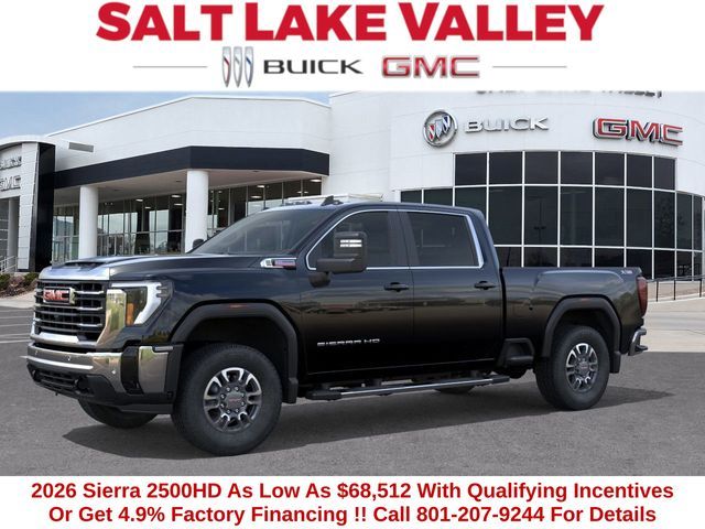 2026 GMC Sierra 2500HD SLE 4D Crew Cab Onyx Black Duramax 6.6L V8 Turbodiesel 4WD --- Please note that the final selling price does not include tax, tag, title, documentation fees, dealer-installed options, or pricing adjustments due to market demand. Financing through GM Financial is required for all discounts to be applied. Special finance offers may not be combined with some factory incentives. While we strive for accuracy, errors may occur, so please verify all information with a customer service representative. For the most accurate pricing, call us at (801) 265-1511 or visit our dealership in person. Prices and payments are subject to change based on manufacturer incentives. ... Sale Price may include dealer discount, $500 - Buick & GMC Consumer Cash Program $500 - Buick GMC Bonus Cash - Price includes $2,000 Down Payment Assistance. Must Finance with GM Financial – Price includes $1,500 Trade-In Allowance for customers trading a 2019 or newer passenger car or truck with under 80,000 miles toward a new 2025–2026 Buick or GMC. Branded or salvage title vehicles do not qualify. Some restrictions apply. See dealer for details.