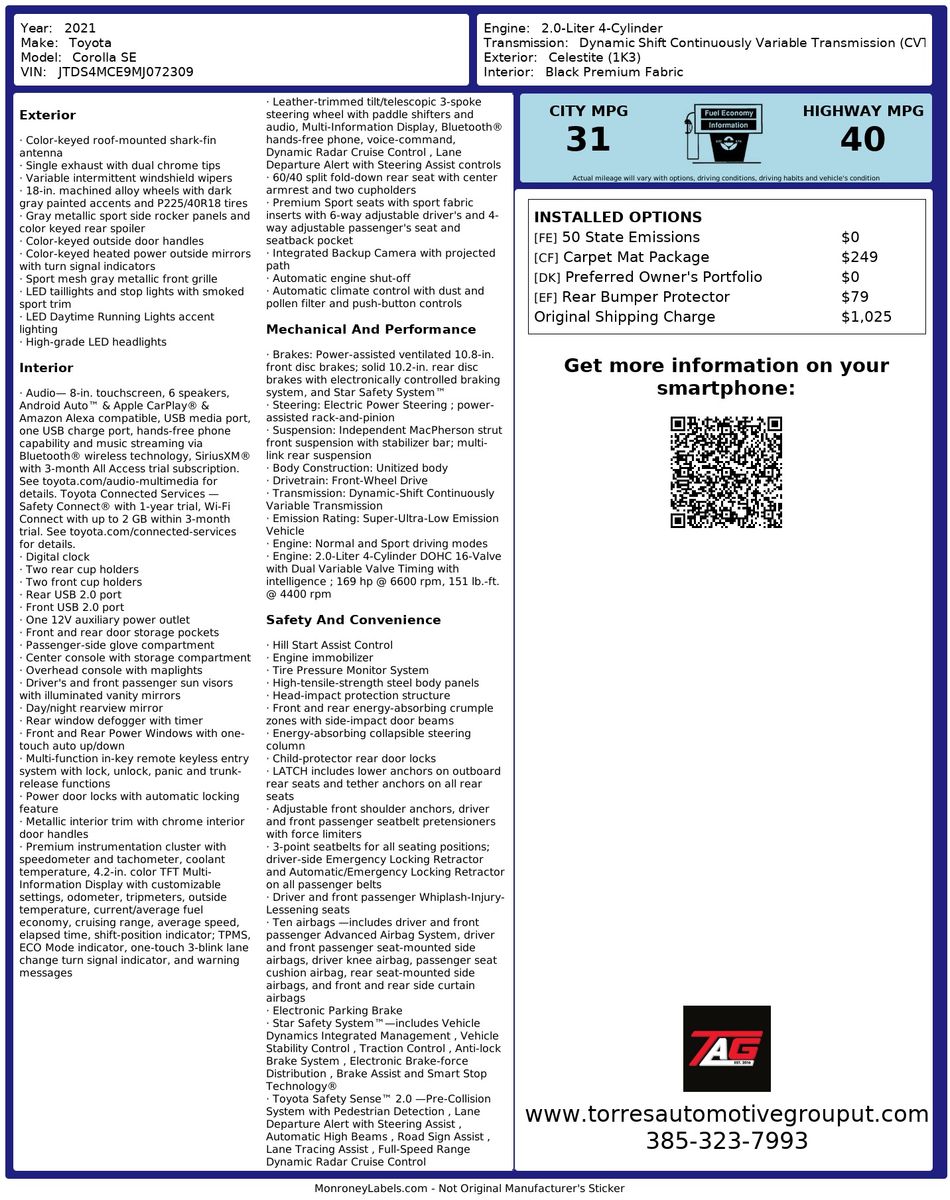 This Corolla SE CVT also comes with a Body Protection Package (TMS)- providing extra assurance as you navigate diverse terrains. Whether you're commuting to work or embarking on a road trip- this vehicle promises reliability and comfort throughout your journey. Perfectly balanced between style- performance- and technology- the 2021 Toyota Corolla SE CVT stands as a remarkable choice for those seeking value and versatility in their driving experience.