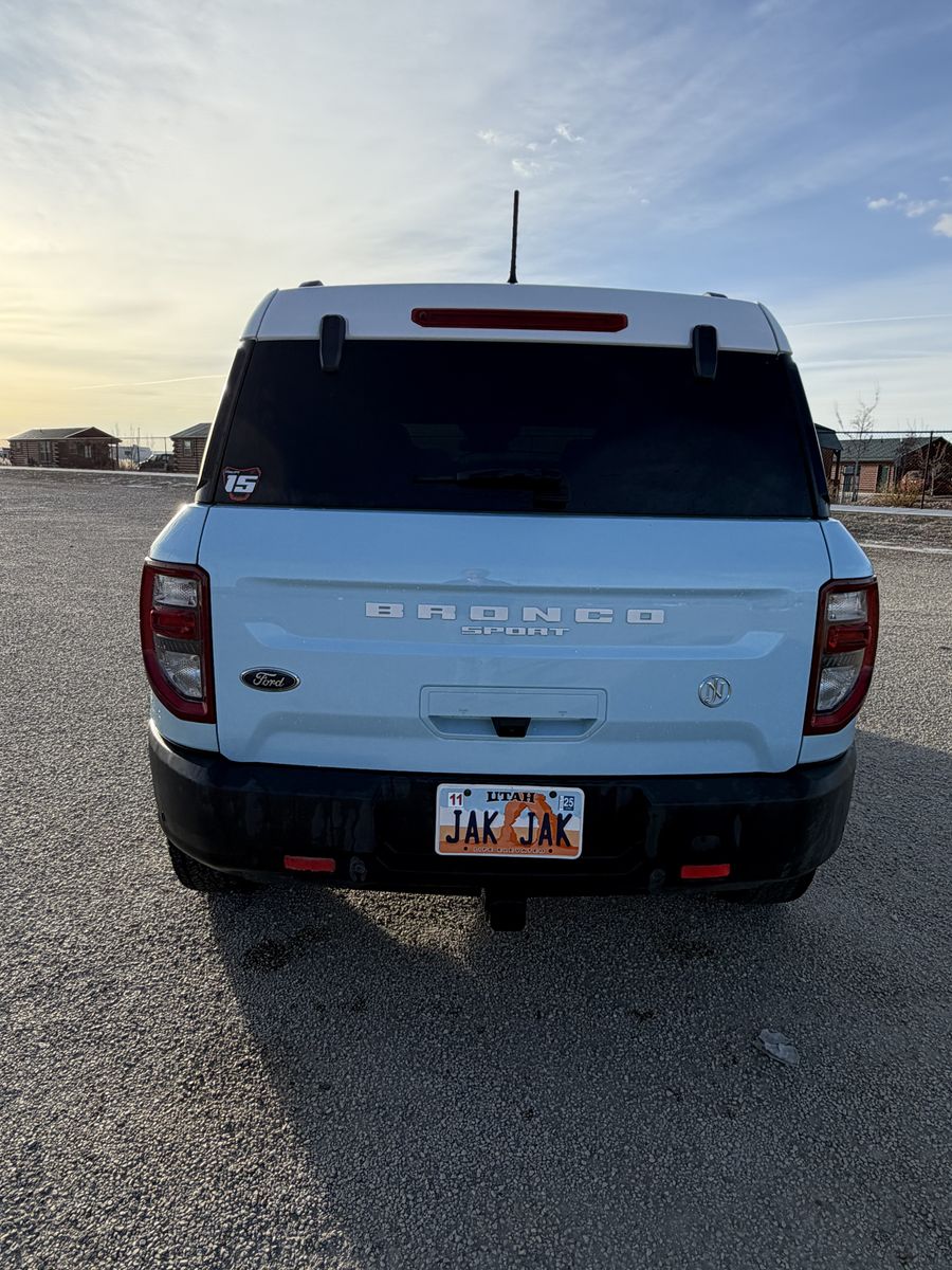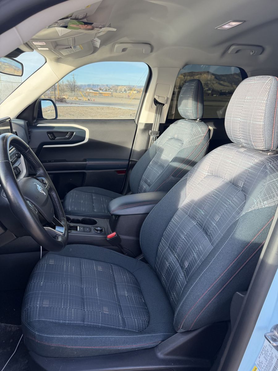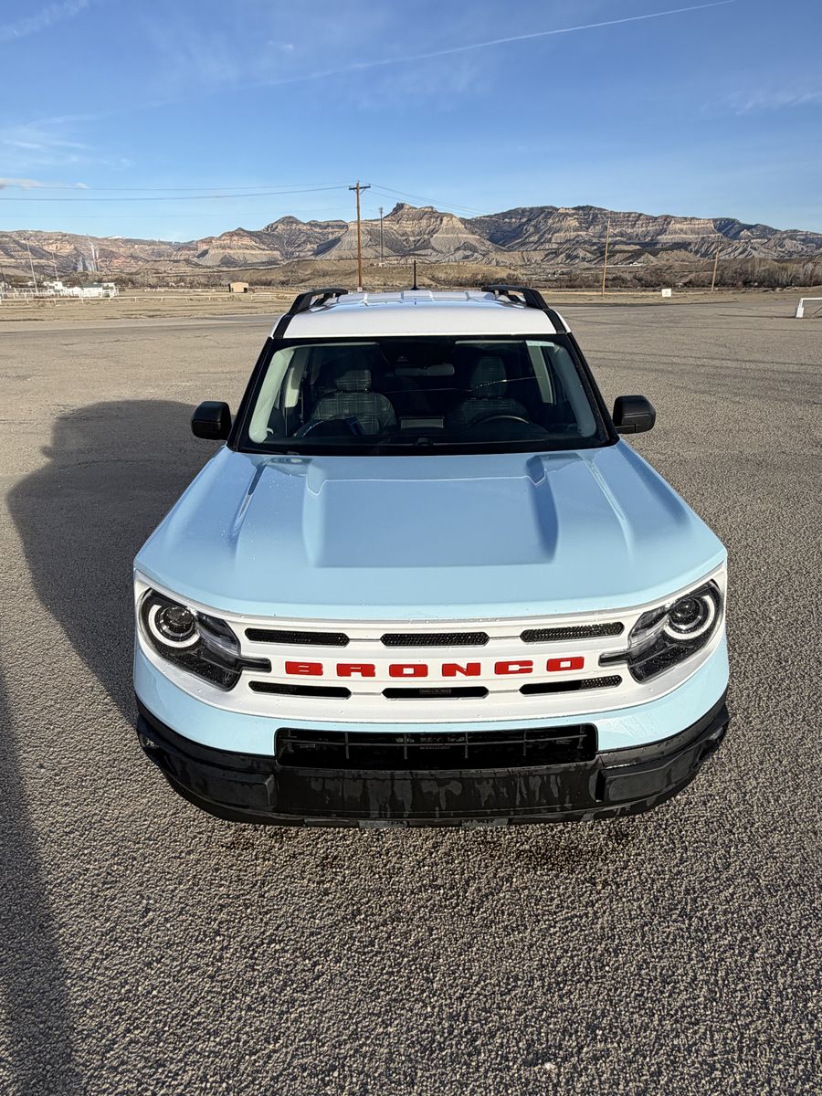 Includes Heritage Convenience Package, Remote keyless entry, Towing Package, Apple CarPlay, Cruise Control, Auto High-Beam Headlights, Heated Front Seats, Rear Parking Sensors, Rear Backup Cameras, Wireless Charging Pad. Oxford White roof, matching 17-inch aluminum wheels, white grille with red "Bronco" lettering, and unique side stripes, plaid interior seats.