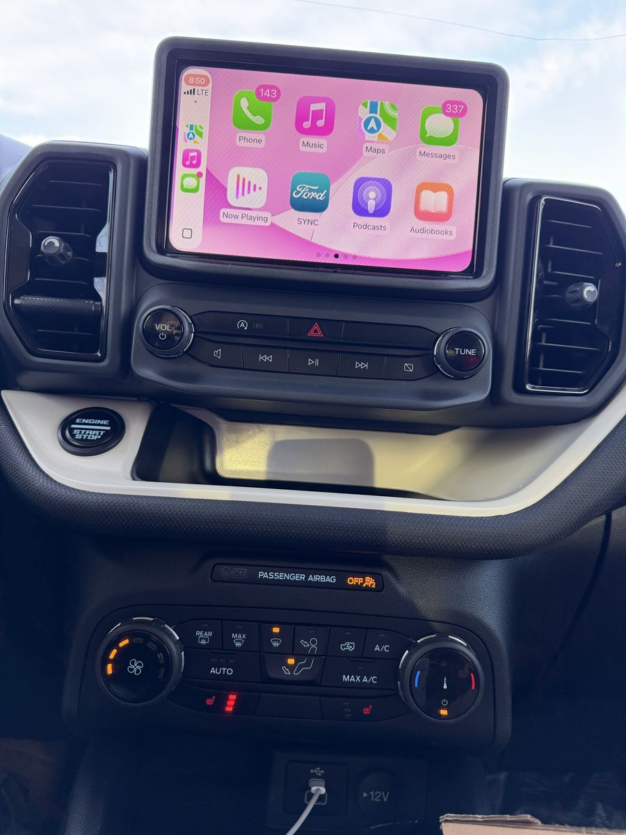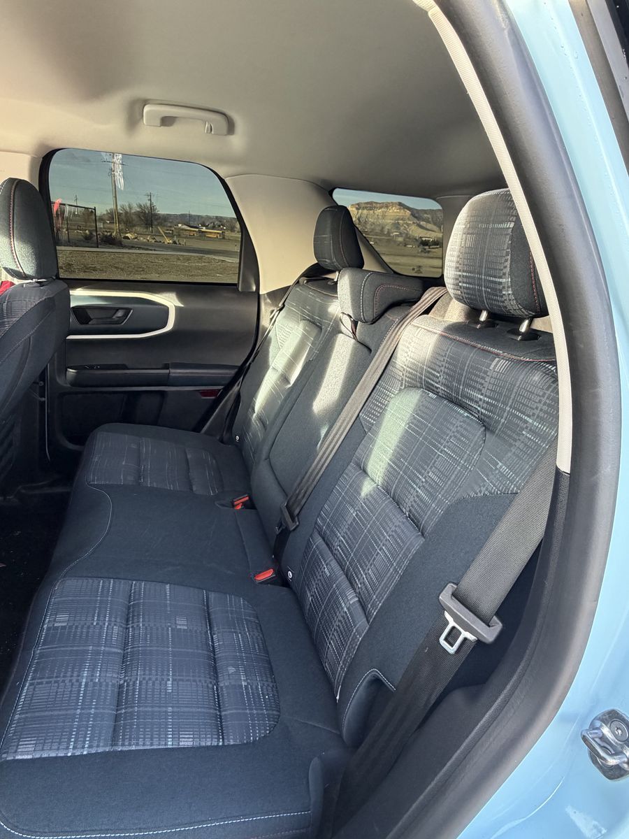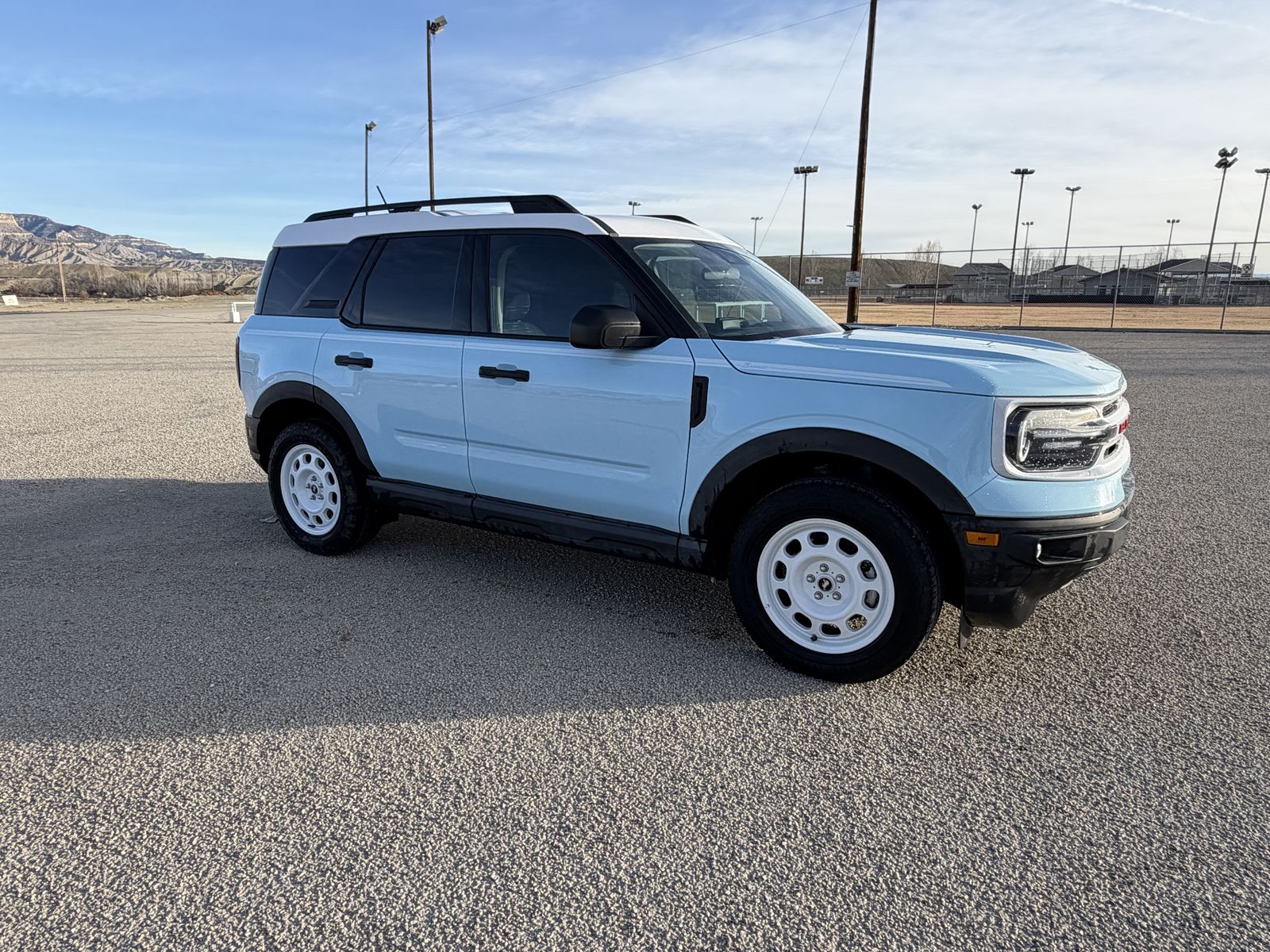 Includes Heritage Convenience Package, Remote keyless entry, Towing Package, Apple CarPlay, Cruise Control, Auto High-Beam Headlights, Heated Front Seats, Rear Parking Sensors, Rear Backup Cameras, Wireless Charging Pad. Oxford White roof, matching 17-inch aluminum wheels, white grille with red "Bronco" lettering, and unique side stripes, plaid interior seats.