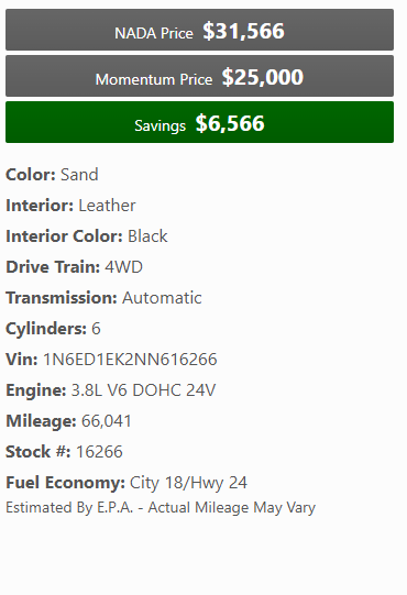 2022 Nissan Frontier Pro-4X with 66k miles! Heated leather seats, rear locking diff, Carplay, bedliner, and more! At Momentum Motors we SELL cars at trade-in prices. We know you work hard for your money, and we want to help you save it. Our company specializes in branded title vehicles which allows our customers to get a quality vehicle for the lowest prices in Utah. Our team hand picks our inventory from insurance auctions all over the country. Each vehicle is repaired in a professional facility with all the proper safety equipment. Unlike the big branded dealerships, we oversee and manage the entire repair process to make sure every vehicle is built to the Momentum Motors standard.. Stop by and see if we can help you find your next car !We are located at 616 S Main St Spanish Fork, Utah. Or call/text 801-804-5364. We buy late model Branded Title Vehicles and accept them on Trade. Call us or bring your Branded Title vehicle by our lot for an instant cash offer. We also pay top dollar for lightly damaged vehicles.