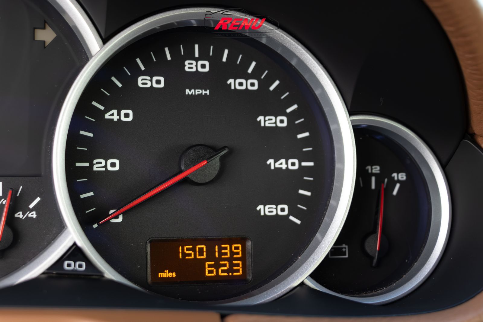The leather-wrapped steering wheel frames an 6,500 rpm tachometer, a 160-mph speedometer, and a central digital display. The odometer indicates 150,139 miles.