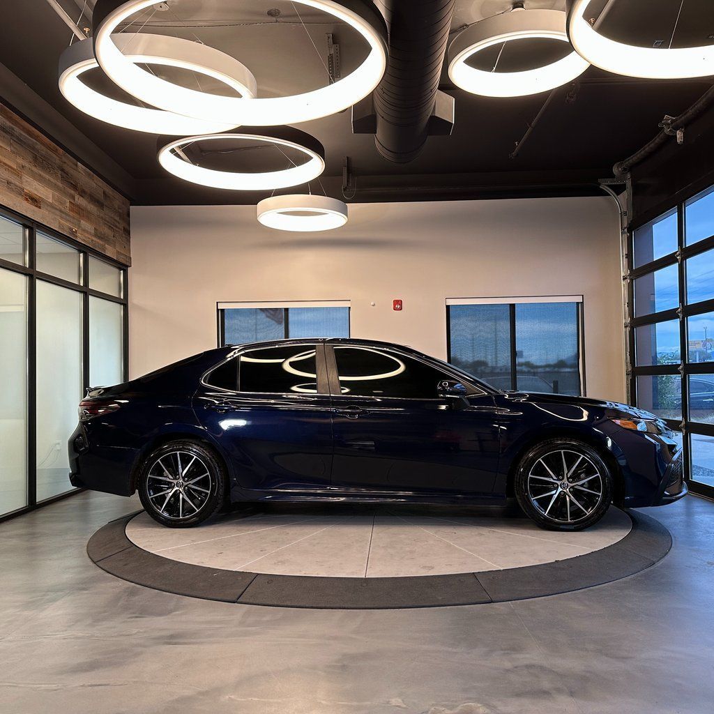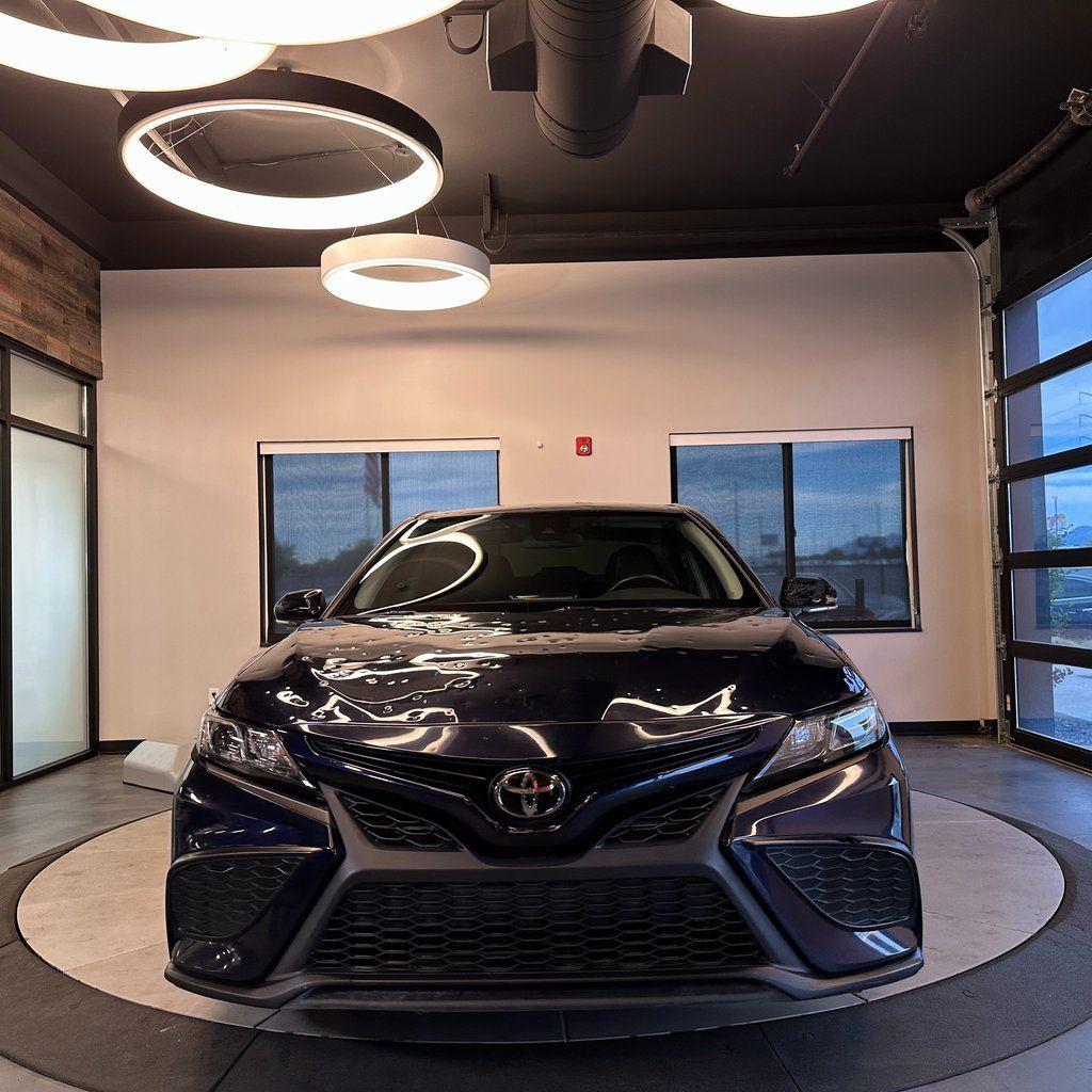 No accident history, SE series with Apple CarPlay/Android Auto, backup camera, 6 Speakers, steering wheel mounted audio controls, and more! 2022 Toyota Camry SE FWD with branded title from hail. 8-Speed Automatic 2.5L I4 DOHC 16V 28/39 City/Highway MPG