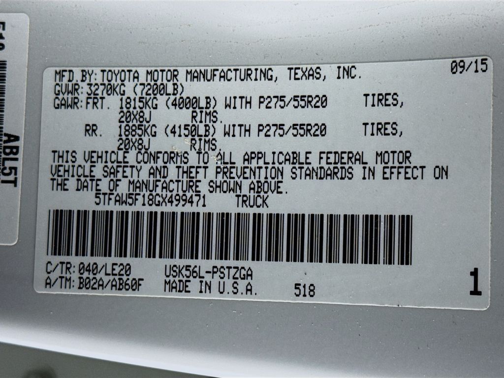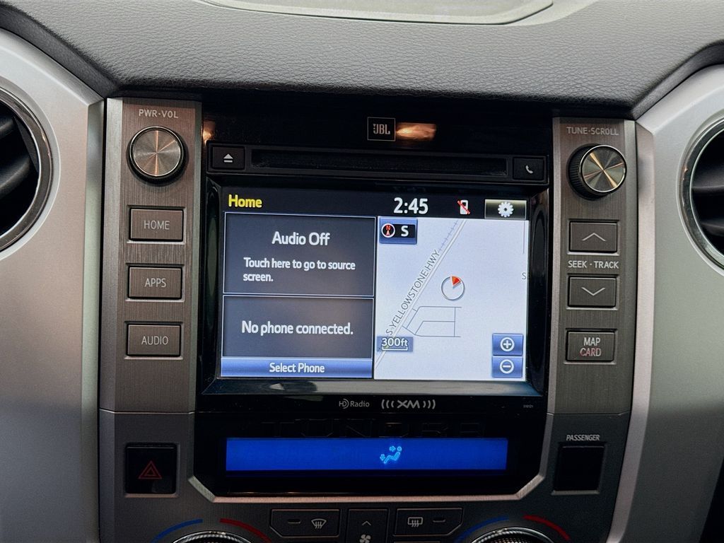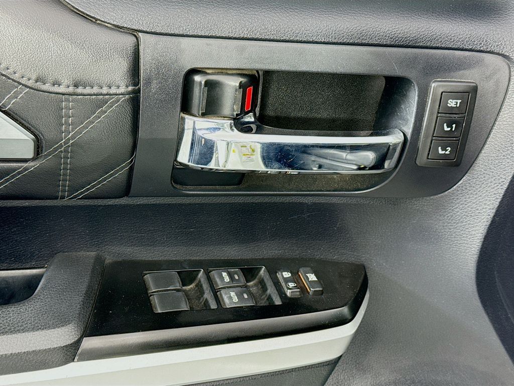 Chrome Tube Steps,Rear mounted camera,Brake assist system,Entune selective service internet access,Cruise control with steering wheel mounted controls,Ventilated driver and front passenger seats,Integrated navigation system with voice activation,Heated driver and front passenger seats,Leather front seat upholstery,Primary monitor touchscreen,First-row sliding and tilting glass sunroof with express open/close activation sunshade,Driver seat power reclining, lumbar support, cushion extension, cushion tilt, fore/aft control and height adjustable control,Part-time 4WD,I-FORCE 5.7L V-8 DOHC, variable valve control, regular unleaded, engine with 381HP,I-FORCE 5.7L V-8 DOHC,Mechanical,Bluetooth wireless audio streaming,Blind spot warning,Dual-zone front climate control,Immobilizer,JBL speakers,NavTraffic real-time traffic,Bluetooth handsfree wireless device connectivity,Entune smart device app link,Trailer brake controller,Trailer sway control,External memory control,Internet radio capability,Electronic stability control system,Leather rear seat upholstery,Automatic climate control,Front and rear parking sensors,LED daytime running lights,3 12V power outlets,Front fog lights,Leather steering wheel,Easy lift tailgate,Easy lower tailgate,Manual rear child safety door locks,Heated driver and passenger side door mirrors,Auto-dimming driver side mirror,Power folding door mirrors,Auto-dimming passenger side mirror,Power tilting steering wheel,Power telescopic steering wheel,Leather upholstered dashboard,20 x 8-inch front and rear machined aluminum wheels,P275/55HR20 AS BSW front and rear tires,8 airbags,Driver front impact airbag,Seat mounted side impact driver airbag