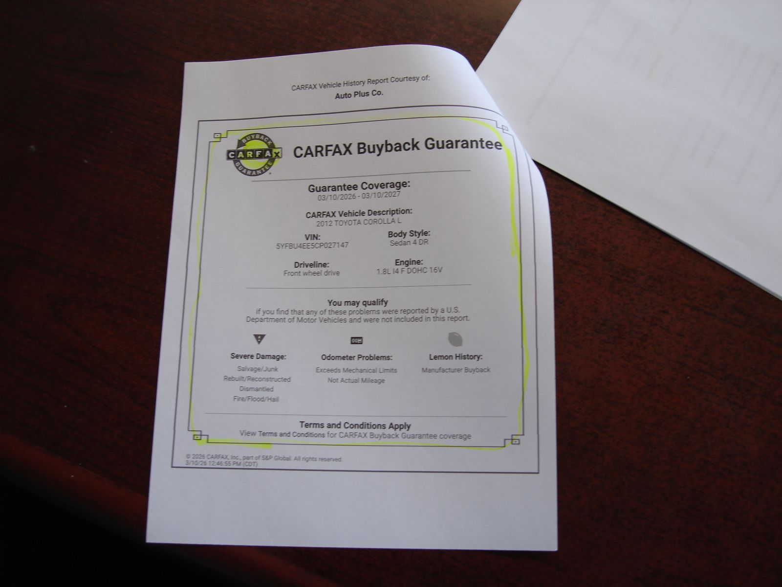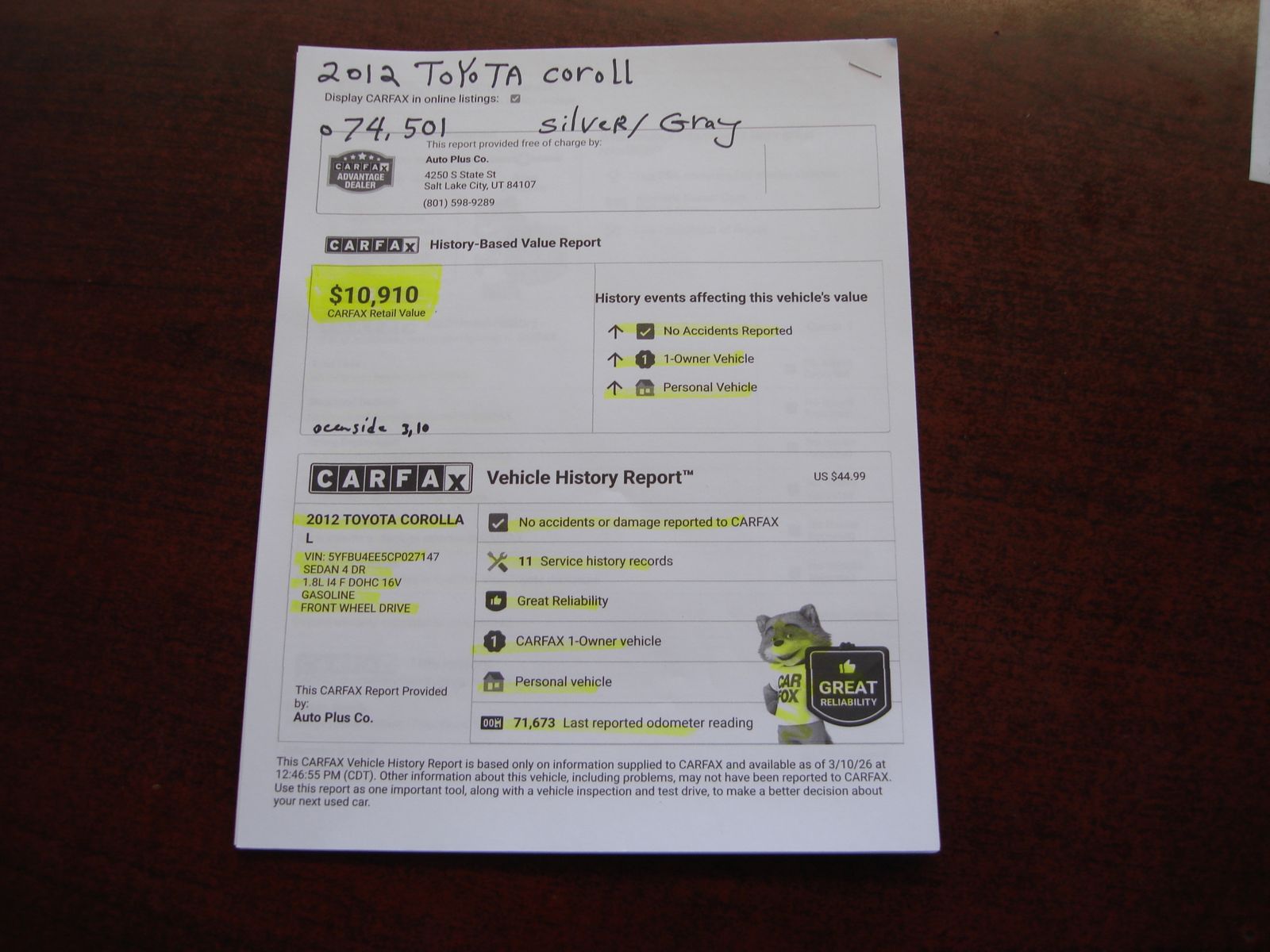 THIS IS A 2012 TOYOTA COROLLA WITH 74000 MILES,FROM OCEANSIDE CALIFORNIA, SEDAN 4 DR. 1.8L 16V, GASOLINE, FRONT WHEEL DRIVE, NO ACCIDENTS, ONE OWNER VEHICLE, ,CLEAN TITLE, CLEAN CARFAX HISTORYHAS POWER LOCKS, WINDOWS, AIR CONDITIONING. NEW TIRES, EMISSION TEST IS DINE , SEE IT AT AUTO PLUS CO. 4250 SO. STATE ST. MURRAY , OR CALL 801-598-9289