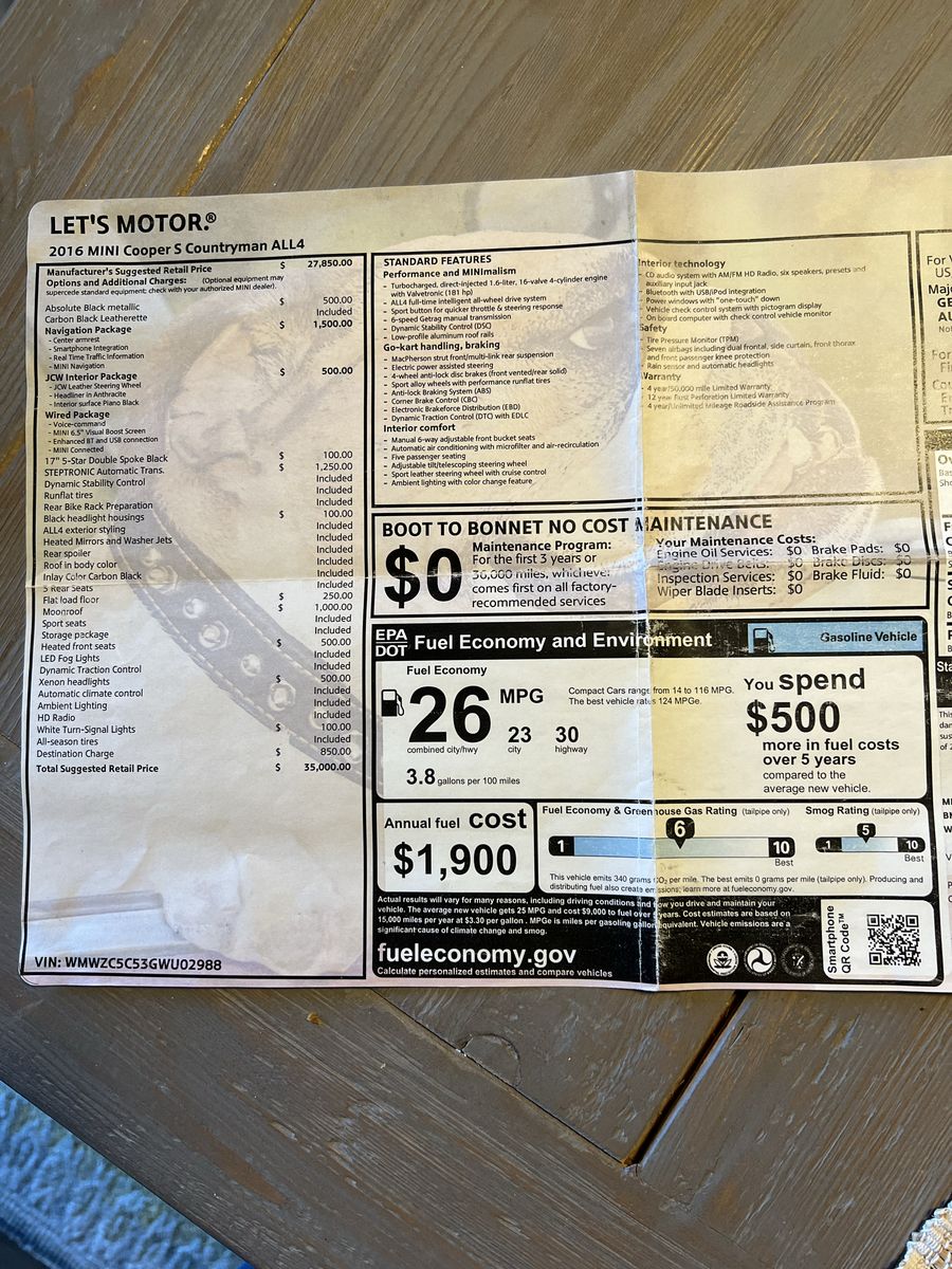 Price Adjustment! Well maintained Countryman S AWD. Fun to drive and great in the snow. Comes with 2 sets of tires and wheels. Tires 75%. Interior of car looks new!