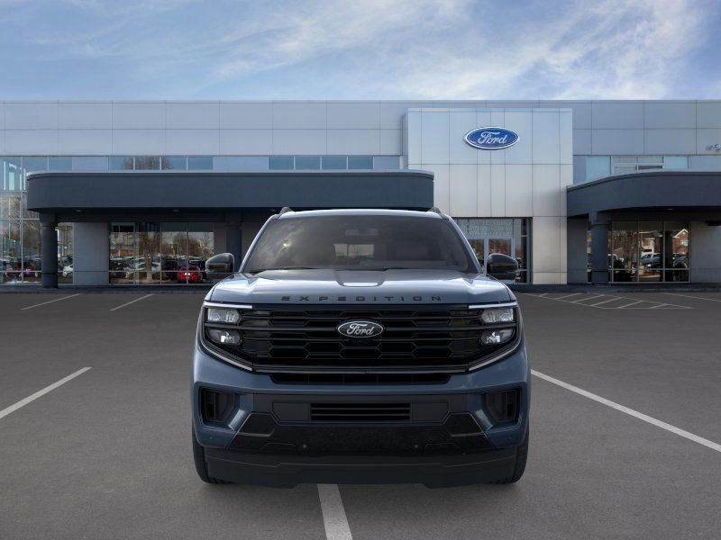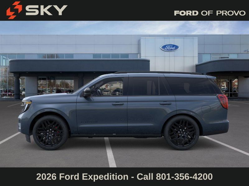 This 2026 Stone Blue Metallic Ford Expedition Platinum 4WD is well equipped and includes these features and benefits: Ford Connectivity Package (1-Year Included), 4WD, 10 Speakers, 2nd Row Power-Folding Captain's Chairs, 3.73 Axle Ratio, 3rd row seats: split-bench, 4-Wheel Disc Brakes, ABS brakes, Air Conditioning, Alloy wheels, AM/FM radio: SiriusXM with 360L, Apple CarPlay/Android Auto, Auto High-beam Headlights, Auto-dimming door mirrors, Auto-dimming Rear-View mirror, Automatic temperature control, Brake assist, Bumpers: body-color, Compass, Delay-off headlights, Driver door bin, Driver vanity mirror, Dual front impact airbags, Dual front side impact airbags, Electronic Stability Control, Emergency communication system: 911 Assist, Exterior Parking Camera Rear, Ford Digital Experience, Four wheel independent suspension, Front anti-roll bar, Front Bucket Seats, Front Center Armrest, Front dual zone A/C, Front reading lights, Fully automatic headlights, Garage door transmitter, Genuine wood dashboard insert, Genuine wood door panel insert, Heated and Ventilated Leather Front Captain's Chairs, Heated door mirrors, Heated front seats, Heated rear seats, Heated steering wheel, Illuminated entry, Leather steering wheel, Low tire pressure warning, Memory seat, Navigation System, Occupant sensing airbag, Outside temperature display, Overhead airbag, Overhead console, Panic alarm, Passenger door bin, Passenger vanity mirror, Power door mirrors, Power driver seat, Power moonroof: Vista Roof, Power passenger seat, Power steering, Power windows, Radio data system, Radio: B&O Sound System by Bang and Olufsen, Rain sensing wipers, Rear air conditioning, Rear anti-roll bar, Rear reading lights, Rear window defroster, Rear window wiper, Reclining 3rd row seat, Remote keyless entry, Security system, SiriusXM with 360L, Speed control, Speed-sensing steering, Speed-Sensitive Wipers, Split folding rear seat, Spoiler, Steering wheel memory, Steering wheel mounted audio controls, Tachometer, Telescoping steering wheel, Tilt steering wheel, Traction control, Trip computer, Turn signal indicator mirrors, Variably intermittent wipers, Ventilated front seats, Voltmeter, and Wheels: 20'' x 8.5'' Ebony Bright Machined Aluminum.
