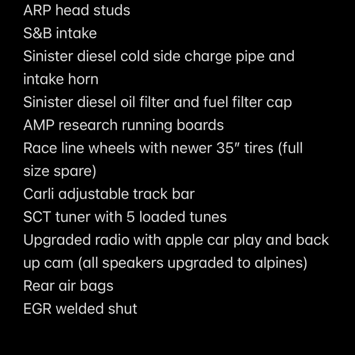 REBUILT TITLE. Going separate ways with the ol 6.0, wife doesnt like the truck because its to loud so choosing to keep the wife and sell the truck. Very well maintained and adult owned its whole life and never ran a “hot tune” SCT tuner to go with the truck with 4 other tune options including hot, currently it’s on a 40 horse tune. And yes it has been “bulletproofed” ARP head studs in addition to new kill devil diesel o-ringed heads. EGR is welded shut and has a 4” straight pipe (I do have an mbrp muffler that will go with the truck) Oil changes done every 8k miles and fuel filters every other. I have paperwork for all the work done on the truck over the last few years. Tons of upgrades to many to list. If you have any questions ask away