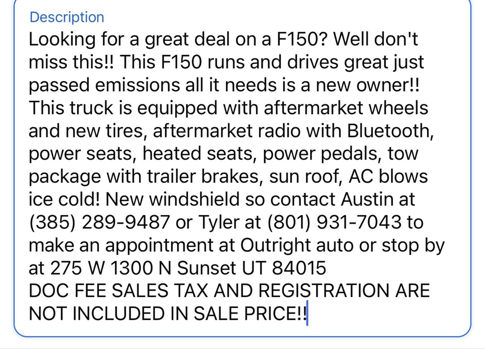 Looking for a great deal on a F150? Well don't miss this!! This F150 runs and drives great just passed emissions all it needs is a new owner!! This truck is equipped with aftermarket wheels and new tires, aftermarket radio with Bluetooth, power seats, heated seats, power pedals, tow package with trailer brakes, sun roof, AC blows ice cold! New windshield Tuff Country lift kit!! So contact Austin at (385) 289-9487 or Tyler at (801) 931-7043 to make an appointment at Outright auto or stop by at 275 W 1300 N Sunset UT 84015