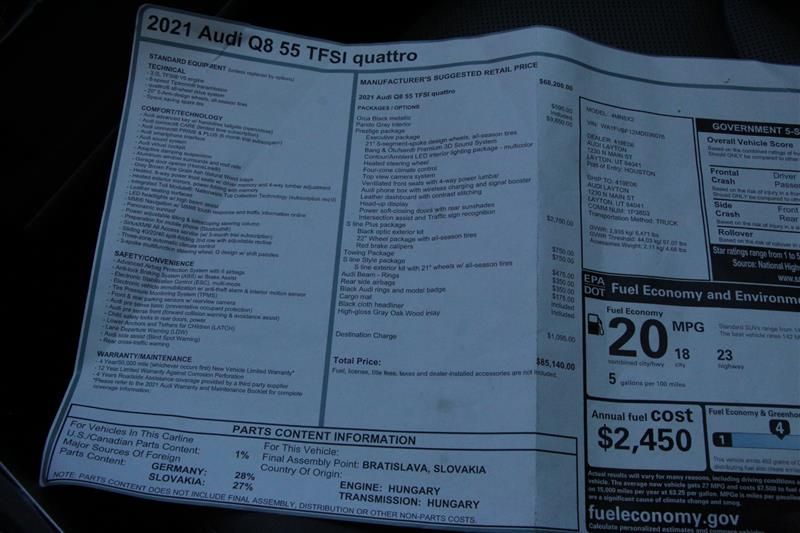 ONE OWNER 2021 AUDI Q8 PRESTIGE QUATTRO with powerful 3.0 TFSI 6 CYLINDER 24-VALVE DOHC engine and driven only 65K miles! THIS Q8 HAS IT ALL! EXECUTIVE PACKAGE, S LINE PLUS PACKAGE, BANG & OLUFSEN 3D ADVANCED SOUND SYSTEM, BLACK OPTIC PACKAGE, TOW HITCH, 360 CAMERAS, 22 INCH WHEELS WITH NEARLY NEW TIRES and much more! CARFAX CERTIFIED, NO ACCIDENTS!FINANCING AVAILABLE Contact our Sales at 801-265-9058.