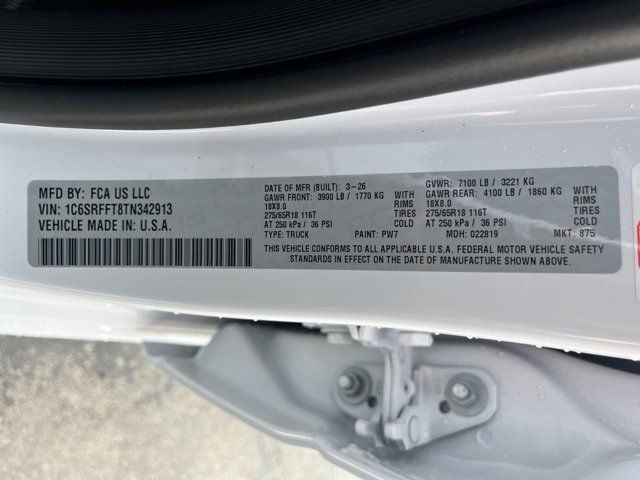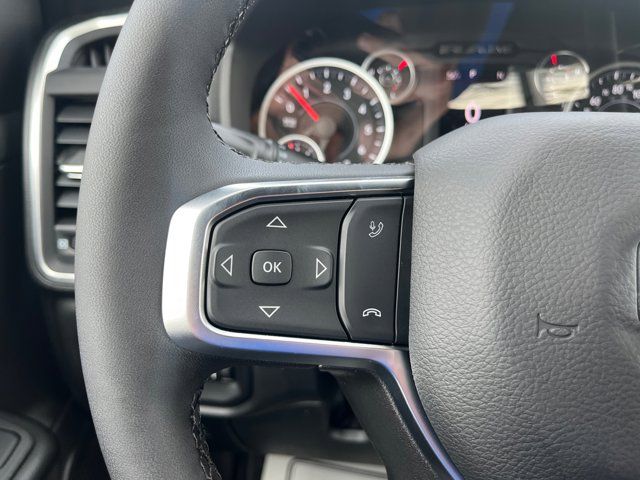Quick Order Package 27Z Big Horn,MyFlexCare Service Plan,Big Horn Level 1 Equipment Group,Cloth Bucket Seats,Bucket Seats,2nd Row in Floor Storage Bins,4 Way Front Headrests,Rear 60/40 Folding Seat,MOPAR Front and Rear Rubber Floor Mats,Heated Front Seats,3 Rear Seat Head Restraints,Rear Center Armrest,Front Seat Back Map Pockets,Full Length Floor Console,Rear Window Defroster,Rear Power Sliding Window,Sun Visors with Illuminated Vanity Mirrors,Auto-Dimming Rear-View Mirror,Auto-Dimming Exterior Driver Mirror,Black Premium Power Mirrors,115V Auxiliary Power Outlet,GPS Antenna Input,Power 2-Way Driver Lumbar Adjust,Manual Adjust 4-Way Driver Seat,Power Adjust 8-Way Driver Seat,Manual Adjust 4-Way Front Passenger Seat,Glove Box Lamp,Black Exterior Mirrors,Exterior Mirrors with Supplemental Signals,Exterior Mirrors Courtesy Lamps,Convex Wide-Angle Exterior Mirror Insert,Manual Folding Exterior Mirrors,Auto Power-Folding Mirrors,Rear Dome with on/Off Switch Lamp,Front License Plate Bracket,Body Color Fender Flares,RAM Grille Badge - Chrome,Exterior Mirrors with Heating Element,Heated Steering Wheel,Global Telematics Box Module,Steering Wheel Mounted Audio Controls,Google Android Auto,USB Host Flip,Apple CarPlay,SiriusXM Satellite Radio,Integrated Center Stack Radio,Connectivity - US/Canada,4G LTE Wi-Fi Hot Spot,Leather Wrapped Steering Wheel,Deluxe Cloth Bucket Seats,Radio: Uconnect 5 W with 8.4 Display,Wheels: 18 x 8 Cast-Aluminum Painted,Center Console Parts Module,SiriusXM Radio Service,Power Adjustable Pedals,48V Belt Starter Generator,Universal Garage Door Opener,Trailer Brake Control,400W Inverter,Integrated Voice Command with Bluetooth,Supplier Part Tracking (J-1),Manufacturer's Statement of Origin,4-Wheel Disc Brakes,Apple CarPlay/Android Auto,Auto High-beam Headlights,Front Center Armrest w/Storage,Compass,Variably intermittent wipers,Trip computer,Traction control,Tilt steering wheel,Telescoping steering wheel,Speed control,Remote keyless entry,Rear step bumper,Rear anti-roll bar,Radio data system,Power windows,Power steering,Power door mirrors,Passenger vanity mirror,Passenger door bin,Panic alarm,Overhead console,Overhead airbag,Outside temperature display,Occupant sensing airbag,Low tire pressure warning,Illuminated entry,Heated door mirrors,Fully automatic headlights,Front wheel independent suspension,Front reading lights,Front fog lights,Front anti-roll bar,Dual front side impact airbags,Dual front impact airbags,Driver door bin,Delay-off headlights,Bumpers: chrome,Brake assist,Alloy wheels,AM/FM radio,ABS brakes,Voltmeter,Tachometer,ParkView Rear Back-Up Camera,Front Bucket Seats,Electronic Stability Control,Air Conditioning,Adaptive Cruise Control,6 Speakers,3.92 REAR AXLE RATIO,BLACK DELUXE CLOTH BUCKET SEATS -inc: Power Adjust 8-Way Driver Seat Rear 60/40 Folding Seat Rear Center Armrest Front Seat Back Map Pockets Power 2-Way Driver Lumbar Adjust,BRIGHT WHITE CLEARCOAT,MYFLEXCARE SERVICE PLAN,BIG HORN LEVEL 1 EQUIPMENT GROUP -inc: SiriusXM Radio Service Rear Window Defroster Rear View Auto Dim Mirror Power Adjustable Pedals Leather Wrapped Steering Wheel Rear Power Sliding Window Rear Dome w/On/Off Switch Lamp Glove Box Lamp Auto Power-Folding Mirrors Auto Dim Exterior Driver Mirror Heated Front Seats Heated Steering Wheel Black Premium Power Mirrors SiriusXM Satellite Radio 400W Inverter Exterior Mirrors w/Supplemental Signals Steering Wheel Mounted Audio Controls Exterior Mirrors Courtesy Lamps Body Color Fender Flares 115V Auxiliary Power Outlet Universal Garage Door Opener 2nd Row In Floor Storage Bins Sun Visors w/Illuminated Vanity Mirrors,WHEELS: 18 X 8 CAST-ALUMINUM PAINTED (STD),MANUFACTURER'S STATEMENT OF ORIGIN,GVWR: 7 100 LBS,ENGINE: 5.7L V8 HEMI MDS VVT ETORQUE -inc: Active Noise Control System Heavy Duty Engine Cooling Passive Tuned Mass Damper GVWR: 7 100 lbs Dual Rear Exhaust w/Bright Tips G/T Exhaust 18 Aluminum Spare Wheel,TRANSMISSION: 8-SPEED AUTOMATIC (8HP75),MOPAR FRONT & REAR RUBBER FLOOR MATS,TIRES: 275/65R18 BSW ALL SEASON LRR (STD),TRAILER BRAKE CONTROL,FRONT LICENSE PLATE BRACKET,QUICK ORDER PACKAGE 27Z BIG HORN -inc: Engine: 5.7L V8 HEMI MDS VVT eTorque Transmission: 8-Speed Automatic (8HP75),Four Wheel Drive,Tow Hitch,Power Steering,ABS,4-Wheel Disc Brakes,Brake Assist,Lithium Ion Traction Battery,Aluminum Wheels,Conventional Spare Tire,Power Mirror(s),Heated Mirrors,Privacy Glass,Intermittent Wipers,Variable Speed Intermittent Wipers,Power Door Locks,Daytime Running Lights,Automatic Headlights,LED Headlights,Fog Lamps,Automatic Highbeams,AM/FM Stereo,Bluetooth Connection,MP3 Capability,Auxiliary Audio Input,Rear Bench Seat,Adjustable Steering Wheel,Trip Computer,Power Windows,Keyless Start,Keyless Entry,Power Door Locks,Cruise Control,Adaptive Cruise Control,A/C,Cloth Seats,Bucket Seats,Passenger Vanity Mirror,Floor Mats,Remote Engine Start,Keyless Start,Remote Engine Start,Smart Device Integration,Requires Subscription,Smart Device Integration,Smart Device Integration,WiFi Hotspot,Bluetooth Connection,Power Windows,Power Door Locks,Trip Computer,Immobilizer,Traction Control,Stability Control,Traction Control,Front Side Air Bag,Rear Parking Aid,Blind Spot Monitor,Cross-Traffic Alert,Front Collision Mitigation,Lane Departure Warning,Lane Keeping Assist,Lane Departure Warning,Tire Pressure Monitor,Driver Air Bag,Passenger Air Bag,Front Head Air Bag,Rear Head Air Bag,Passenger Air Bag Sensor,Child Safety Locks,Back-Up Camera