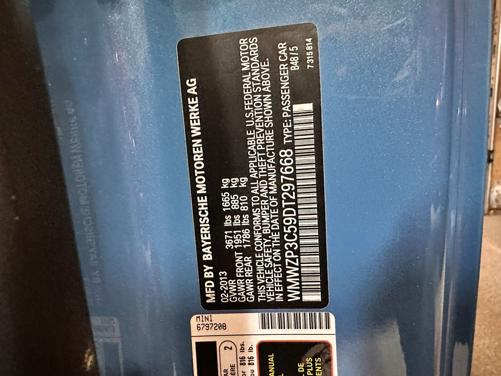 2013 Mini, one owner. Only 14,700 miles. Garage kept all the time. We only drive it on weekends in the summer so the mileage is very low. Car is in great condition and it is a manual so very fun to drive.