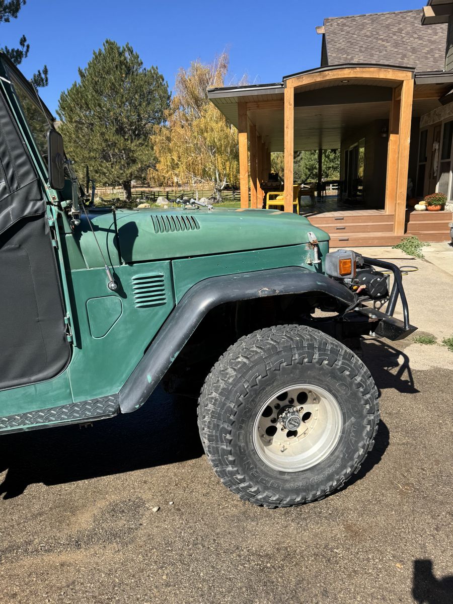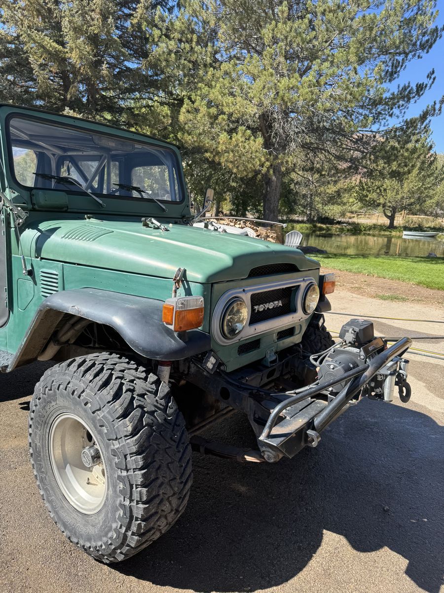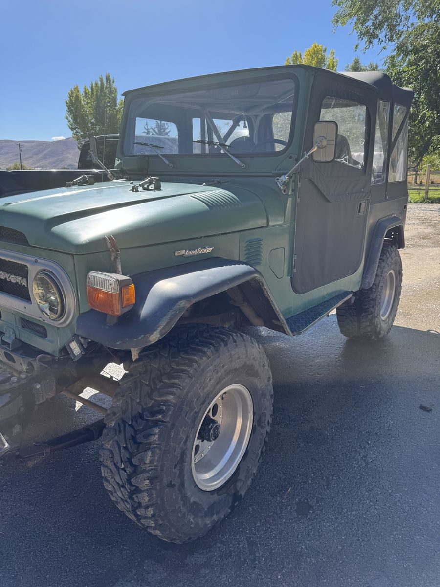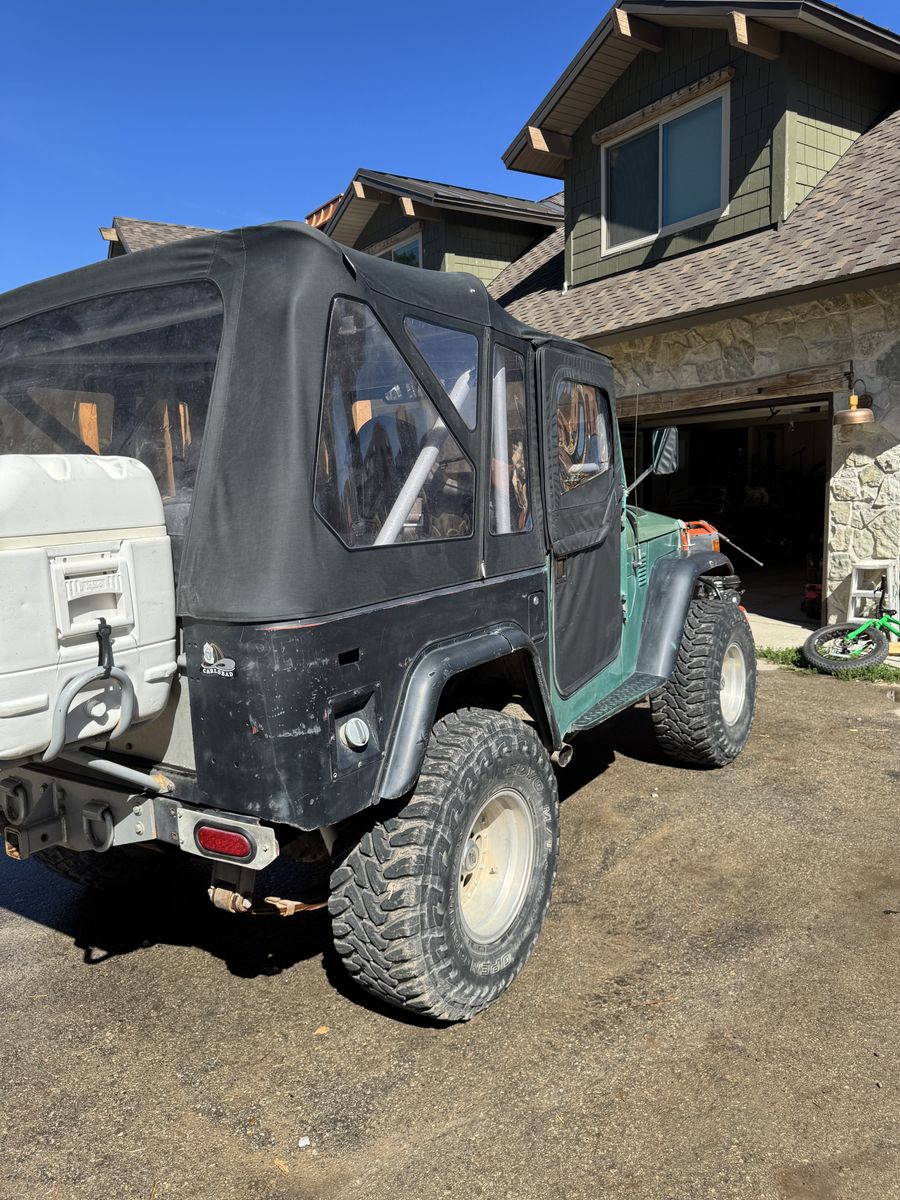 1976 Toyota Land Cruiser FJ40, powered by a Chevy V8 swap.==This upgraded, classic 4x4 features power steering for easy handling, custom wiring, race seats, and a brand-new soft top==. A powerful, reliable, and classic trail-ready rig combining vintage style with modern performance improvements.