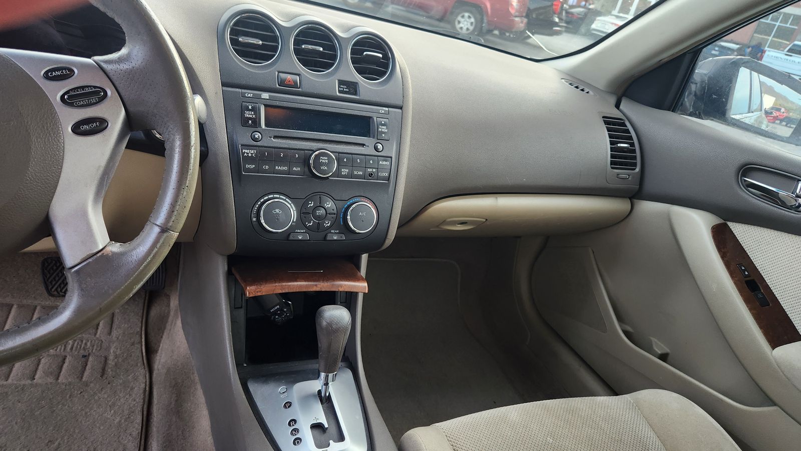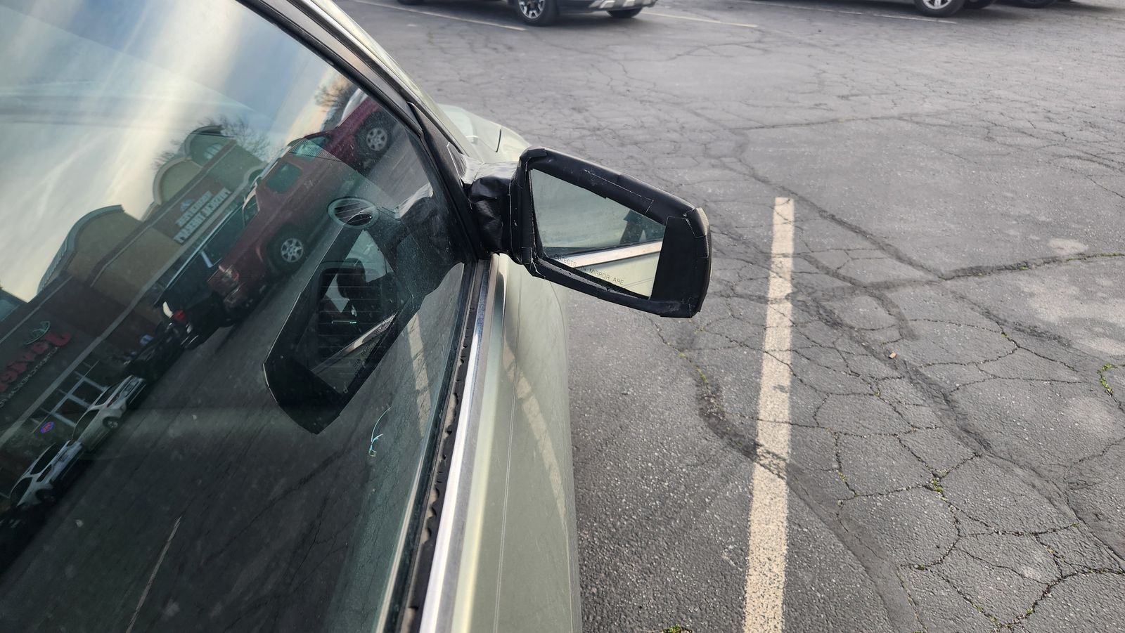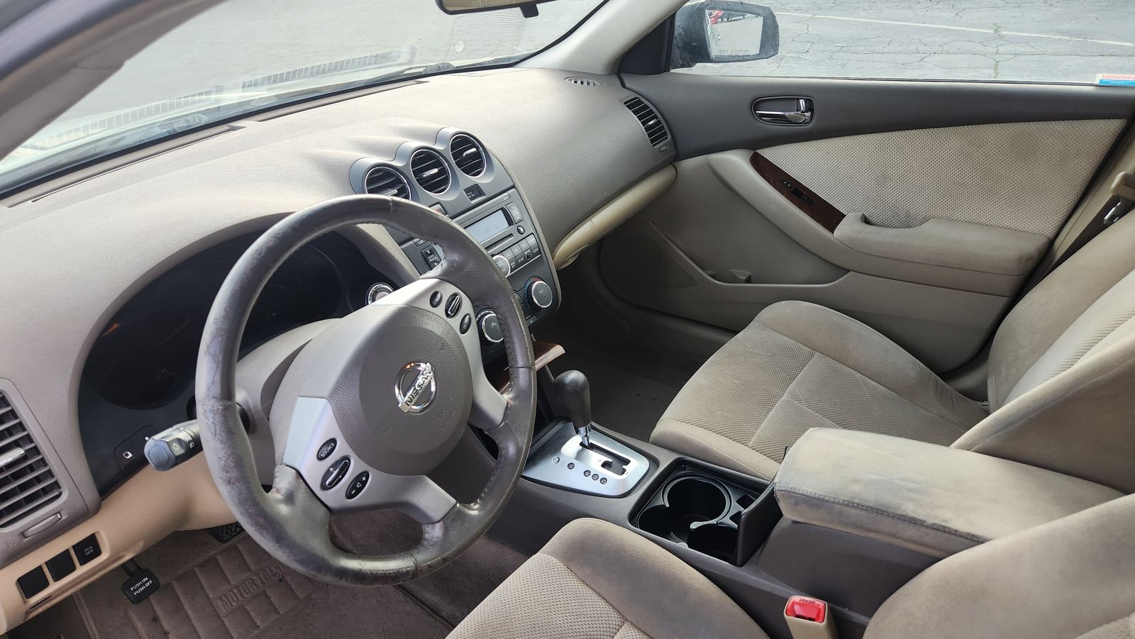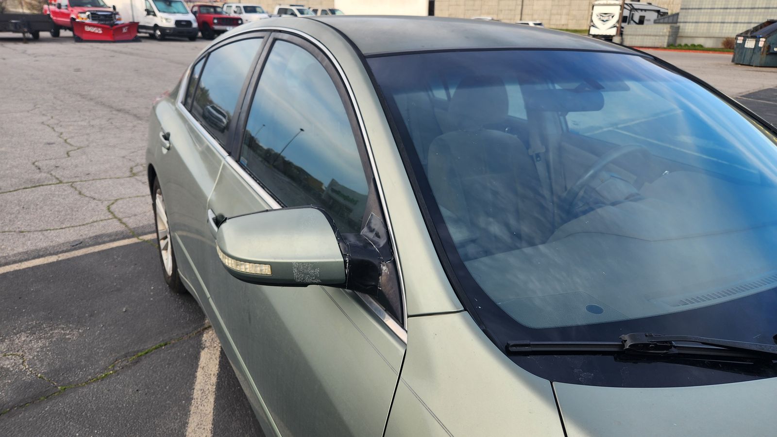 The exterior has sun spots and the passenger mirror is currently taped on. The AC and heater need repaired.