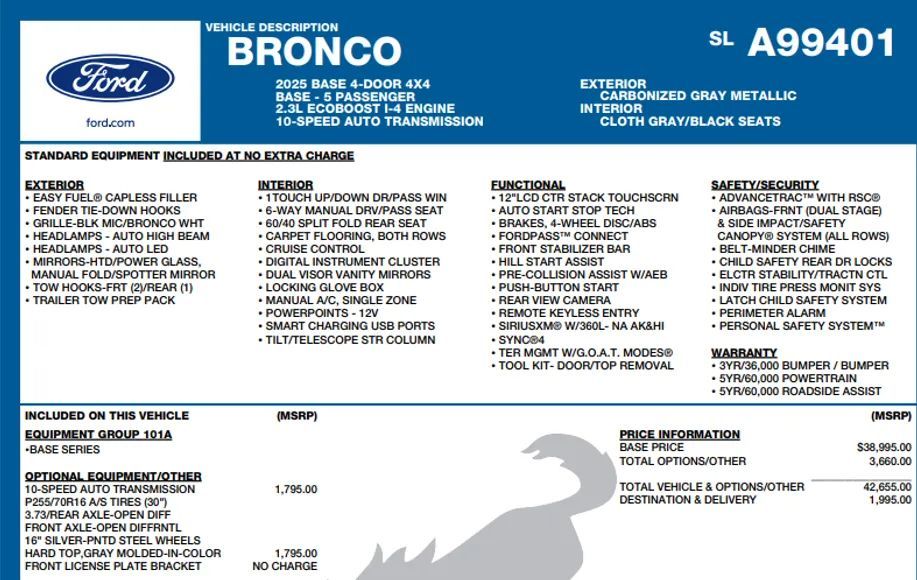 2.3L ECOBOOST I-4 ENGINE10-SPEED AUTO TRANSMISSIONP255/70R16 A/S TIRES (30")3.73/REAR AXLE-OPEN DIFFFRONT AXLE-OPEN DIFFRNTL16" SILVER-PNTD STEEL WHEELSHARD TOP,GRAY MOLDED-IN-COLOR