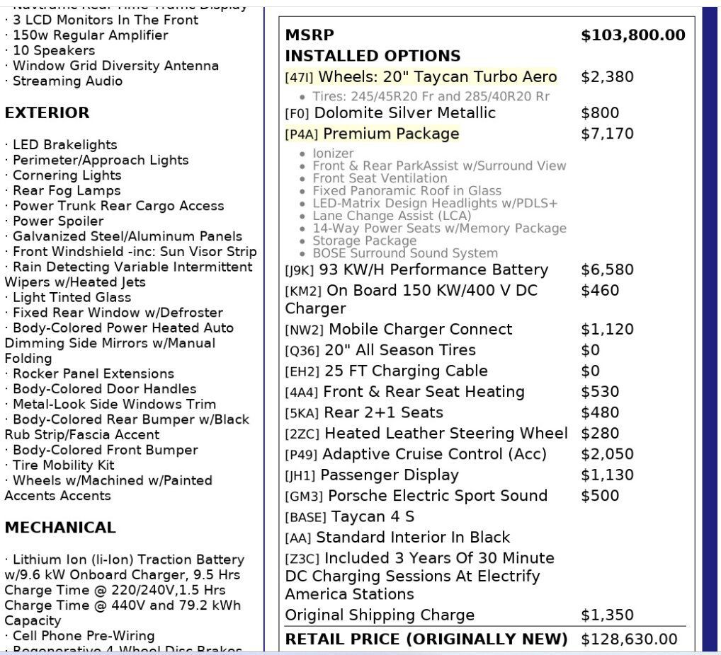 ABSOLUTELY Futuristic Car! The Ultimate Electric Sports Sedan- The Porsche Taycan 4S All Wheel Drive! Dressed in Gorgeous Color Combo; 'Dolomite Silver Metallic' Exterior on 'Black Nappa' Leather Interior! SUPER Clean- check out ALL 92 Pictures. HARD Loaded and Highly Optioned- $128,630 Original MSRP. Clean Title and Carfax. Recently Serviced and Thoroughly inspected- not a single problem. Serviced only by Porsche Dealership. OPTIONS: Premium Package, 93 KW/H Performance Battery, Mobile Charger Connect, Front and Rear Seat Heating, Adaptive Cruise Control, Passenger Display and more. Comes with Original Owner's manuals, Original MSRP Window Sticker, Original DC Home Charger, Two Sets of Keys and Qualifies for an Extended Warranty up to an additional 60 Months/ 100k Miles.