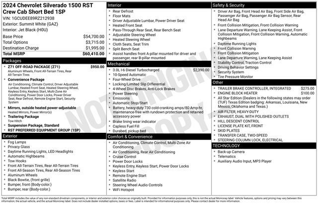 Turn every drive into something special with this Chevrolet Silverado 1500 from Salt Lake Valley Chevrolet! Designed for comfort, performance, and style, this vehicle comes fully equipped with modern technology and convenience features you’ll love. Price excludes tax, title, license fee, government fees, and $449 dealer documentary service fee. While every reasonable effort is made to ensure accuracy, we are not responsible for errors or omissions, and vehicles may be sold prior to inquiry—please contact the dealer to confirm availability. All financing is subject to approved credit. If you’re shopping for used cars in Salt Lake City, or searching for the perfect SUV, truck, or sedan, this Chevrolet Silverado 1500 delivers the dependability and value you’re looking for. It’s the ideal match for your lifestyle - ready for everything from mountain adventures to city commutes. Visit Salt Lake Valley Chevrolet today and see why so many Utah drivers trust us for great deals on quality pre-owned vehicles. Explore our inventory online at www.slvchevy.com or call 801-969-8221 to schedule your test drive today! This impressive vehicle includes Convenience Package (10-Way Power Driver Seat w/Lumbar, 120-Volt Bed Mounted Power Outlet, 120-Volt Interior Power Outlet, Dual Rear USB Ports (Charge Only), Dual-Zone Automatic Climate Control, Electric Rear-Window Defogger, Heated Driver & Front Outboard Passenger Seats, Heated Steering Wheel, Keyless Open & Start, Remote Vehicle Starter System, Theft Deterrent System (Unauthorized Entry), and Wrapped Steering Wheel), Preferred Equipment Group 1SP (12.3'' Multicolor Reconfigurable Digital Display, 6-Speaker Audio System, All-Star Edition, Auto-Locking Rear Differential, Bluetooth® For Phone, Chevrolet Connected Access Capable, Color-Keyed Carpeting Floor Covering, Deep-Tinted Glass, Electrical Steering Column Lock, Electronic Cruise Control, EZ Lift Power Lock & Release Tailgate, Front Frame-Mounted Black Recovery Hooks, Front LED Fog Lamps, Front Rubberized Vinyl Floor Mats, HD Rear Vision Camera, Heated Power-Adjustable Outside Mirrors, High Gloss Black Mirror Caps, Inside Rear-View Mirror w/Tilt, LED Cargo Area Lighting, OnStar & Chevrolet Connected Services Capable, Power Front Windows w/Driver Express Up/Down, Power Front Windows w/Passenger Express Down, Power Rear Windows w/Express Down, Rear 60/40 Folding Bench Seat (Folds Up), Rear Rubberized-Vinyl Floor Mats, SiriusXM w/360L, Standard Tailgate, Steering Wheel Audio Controls, and Wi-Fi Hot Spot Capable), Standard Suspension Package, Trailering Package (Hitch Guidance), Z71 Off-Road Package (Dual Exhaust w/Polished Outlets, Heavy-Duty Air Filter, Hill Descent Control, and Off-Road Suspension), 220 Amp Alternator, 3.23 Rear Axle Ratio, 4-Wheel Disc Brakes, 40/20/40 Front Split-Bench Seat, 6 Speakers, ABS brakes, Air Conditioning, Alloy wheels, AM/FM radio: SiriusXM with 360L, Auto High-beam Headlights, Automatic Emergency Braking, Automatic temperature control, Brake assist, Bumpers: body-color, Cloth Seat Trim, Compass, Delay-off headlights, Driver door bin, Driver vanity mirror, Dual front impact airbags, Dual front side impact airbags, Electronic Stability Control, Engine Block Heater, Following Distance Indicator, Forward Collision Alert, Front anti-roll bar, Front Center Armrest w/Storage, Front dual zone A/C, Front fog lights, Front License Plate Kit, Front Pedestrian Braking, Front reading lights, Front wheel independent suspension, Fully automatic headlights, Heated door mirrors, Heated front seats, Heated steering wheel, Illuminated entry, Integrated Trailer Brake Controller, IntelliBeam Automatic High Beam On/Off, Lane Keep Assist w/Lane Departure Warning, Low tire pressure warning, Occupant sensing airbag, Outside temperature display, Overhead airbag, Overhead console, Panic alarm, Passenger door bin, Passenger vanity mirror, Power door mirrors, Power driver seat, Power steering, Power windows, Premium audio system: