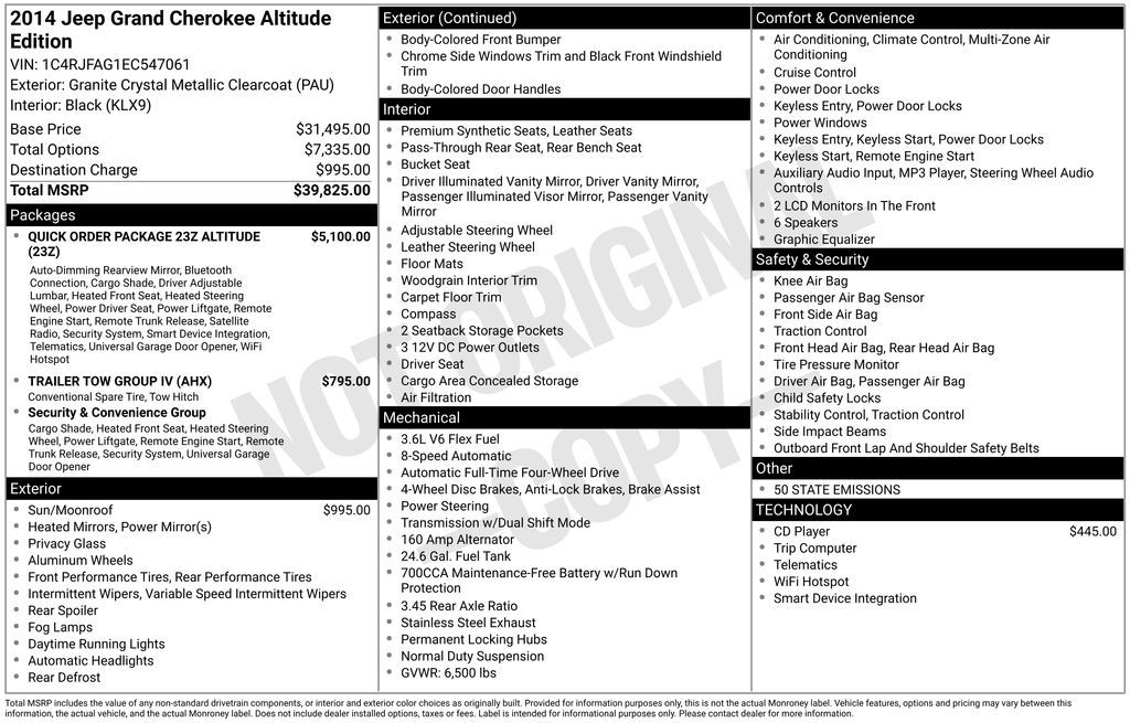 Granite Crystal Metallic Clearcoat 2014 Jeep Grand Cherokee Altitude 4WD 8-Speed Automatic 3.6L V6 Flex Fuel 24V VVT Check out our award winning dealership! 5-star google review, drive a little save a lot. Price excludes tax, title, license fee, government fees, and $449 dealer documentary service fee. While every reasonable effort is made to ensure accuracy, we are not responsible for errors or omissions. Vehicles may be sold prior to inquiry. Please contact dealer to confirm availability. Vehicles listed as “Not in Stock” may be available within a reasonable timeframe, not to exceed one week. All financing is subject to approved credit. 4WD.