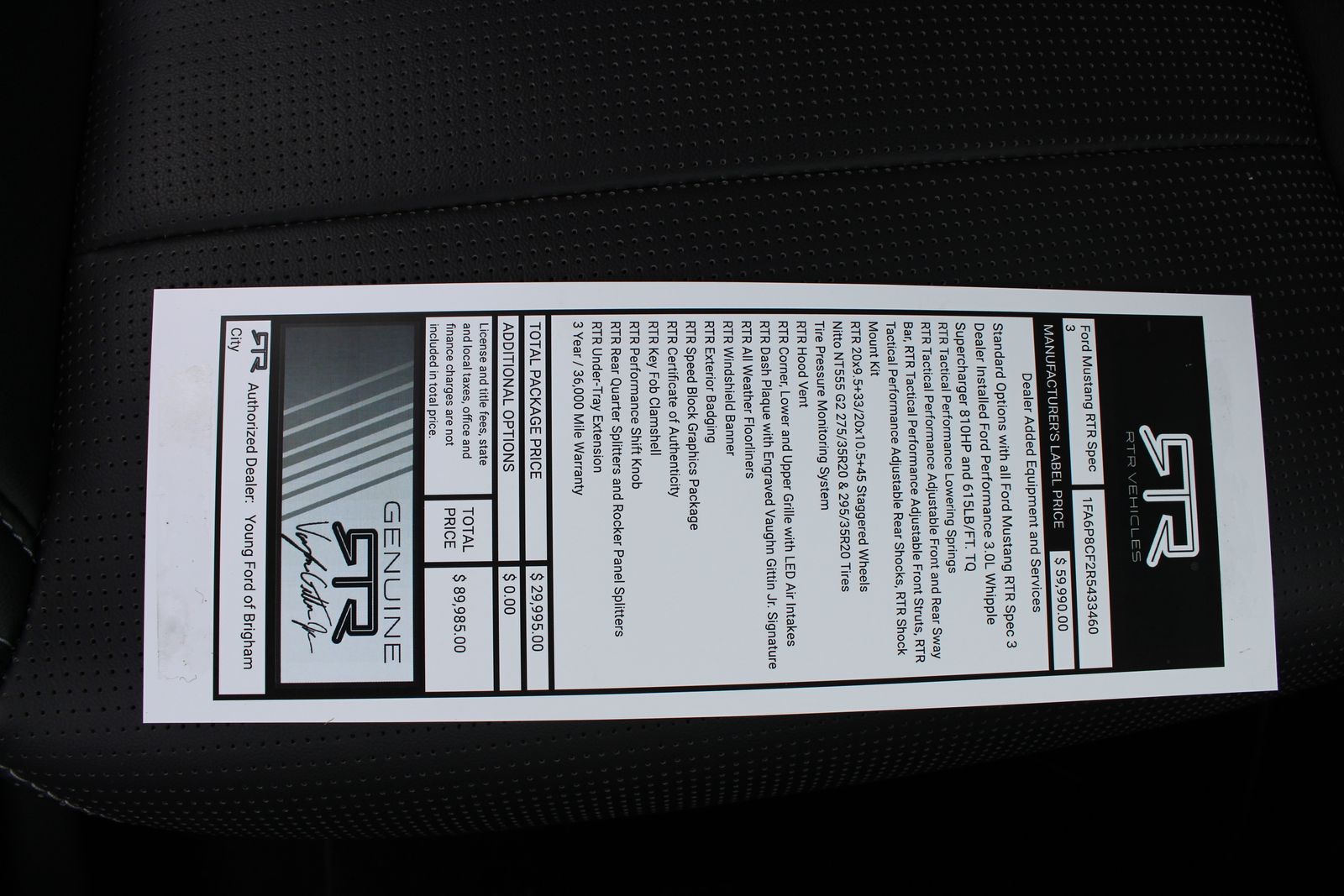 What truly separates this Mustang from the rest is the full RTR Spec 3 package, engineered by RTR Vehicles to elevate both performance and styling. This build features aggressive RTR-specific design elements including a distinctive upper and lower grille with integrated LED air intakes, signature badging, a hood vent, windshield banner, and a serialized dash plaque bearing the signature of Vaughn Gittin Jr. The exterior is further enhanced with RTR aero components like rear quarter splitters, rocker panel splitters, and a decklid panel, giving the car a bold, track-inspired stance that commands attention from every angle. This is not just a visual upgrade—every detail is designed with purpose and performance in mind.