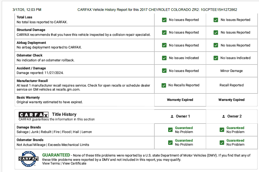 Selling my 2017 Chevy Colorado ZR2 with the 2.8L Duramax diesel and 95,500 miles for $22,500 ($2,730 under Carfax Suggested Retail Price). The truck has a clean Carfax, has always been garaged, and has been well maintained. The Duramax diesel provides excellent torque and efficiency and makes for a great daily driver, tow vehicle, or adventure truck.