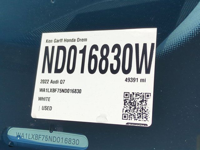 Recent Arrival! Odometer is 9455 miles below market average! 3.0L TFSI 10 Speakers, 3.204 Axle Ratio, 3rd row seats: bench, 4-Wheel Disc Brakes, ABS brakes, Air Conditioning, Alloy wheels, AM/FM radio: SiriusXM, Audi smartphone interface (Apple CarPlay/Android Auto), Auto High-beam Headlights, Auto-dimming door mirrors, Auto-dimming Rear-View mirror, Automatic temperature control, Brake assist, Bumpers: body-color, Compass, Delay-off headlights, Driver door bin, Driver vanity mirror, Dual front impact airbags, Dual front side impact airbags, Electronic Stability Control, Emergency communication system: Audi connect CARE, PRIME & PLUS, Exterior Parking Camera Rear, Four wheel independent suspension, Front anti-roll bar, Front Bucket Seats, Front Center Armrest, Front dual zone A/C, Front fog lights, Front reading lights, Fully automatic headlights, Garage door transmitter: HomeLink, Genuine wood door panel insert, Heated door mirrors, Heated Front Bucket Seats, Heated front seats, Illuminated entry, Leather Seating Surfaces, Leather Shift Knob, Leather steering wheel, Low tire pressure warning, Memory seat, Navigation system: Audi MMI Navigation plus with Touch Response, Occupant sensing airbag, Outside temperature display, Overhead airbag, Overhead console, Panic alarm, Passenger door bin, Passenger vanity mirror, Power door mirrors, Power driver seat, Power Liftgate, Power moonroof: Panoramic, Power passenger seat, Power steering, Power windows, Radio data system, Radio: Audi Sound System, Rain sensing wipers, Rear air conditioning, Rear anti-roll bar, Rear fog lights, Rear reading lights, Rear seat center armrest, Rear side impact airbag, Rear window defroster, Rear window wiper, Reclining 3rd row seat, Remote keyless entry, Roof rack: rails only, Security system, Speed control, Speed-sensing steering, Split folding rear seat, Spoiler, Steering wheel memory, Steering wheel mounted audio controls, Tachometer, Telescoping steering wheel, Tilt steering wheel, Traction control, Trip computer, Turn signal indicator mirrors, Variably intermittent wipers, Wheels: 19 5-Arm-Star Design. quattroBuy with Confidence! ALL CUSTOMERS receive FREE GARFF CARE!! Includes free roadside assistance such as jumping a dead battery, towing, unlocking your vehicle, fuel if you run out of gas, complimentary car washes, and flat tire repair!DealerRater DEALER OF THE YEAR!! https://tinyurl.com/u436793 --- CARFAX TOP RATED DEALER!! Exclusive 60 MINUTE BUYING EXPERIENCE!2022 Audi Q7 55 Premium Plus quattro Tbd
