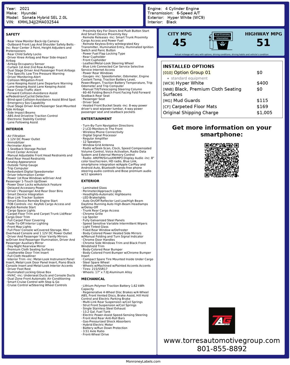 At its heart- the Sonata Hybrid SEL is powered by a 2.0L 4-cylinder engine- delivering an excellent balance of power and fuel efficiency. The inclusion of Option Group 01 ensures that drivers have access to a range of advanced features and modern conveniences- enhancing both safety and entertainment. Whether you're navigating city streets or cruising on the highway- this hybrid is designed to make every journey enjoyable and efficient.
