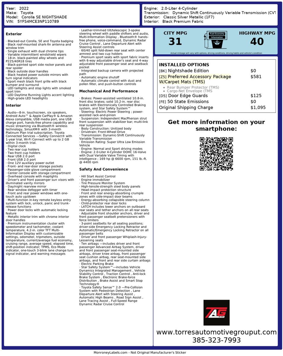 Under the hood- the Corolla is powered by a robust 2.0L 4-cylinder engine- delivering a blend of efficiency and spirited performance- perfectly suited for both city commutes and highway journeys. The model features the SE Nightshade CVT (Natl) styling- incorporating sporty elements and unique accents that enhance its dynamic character.