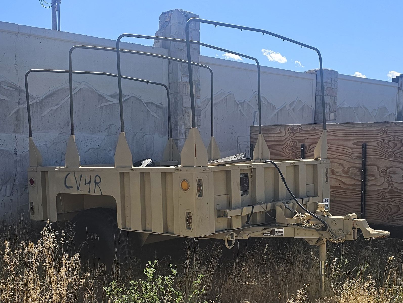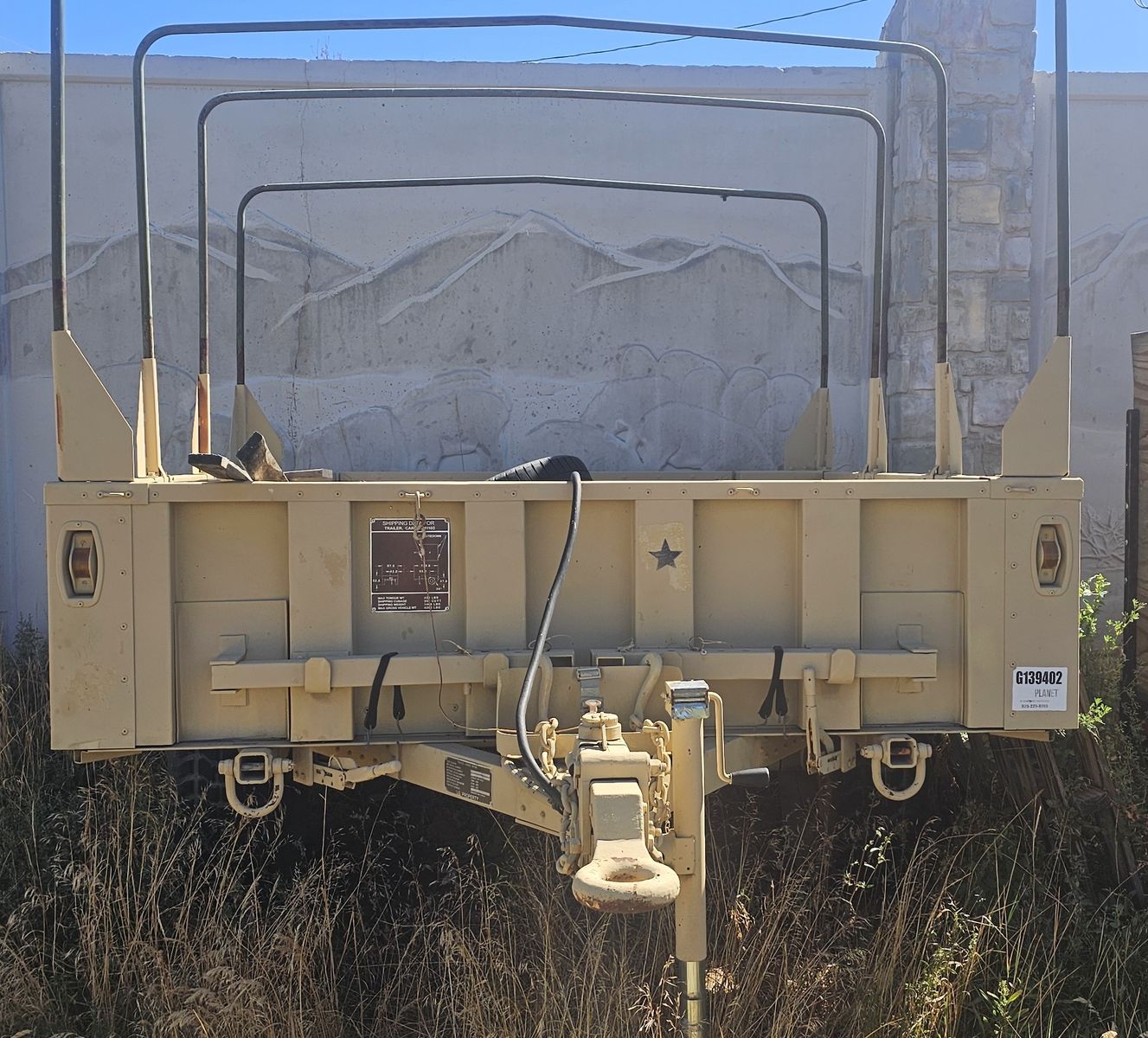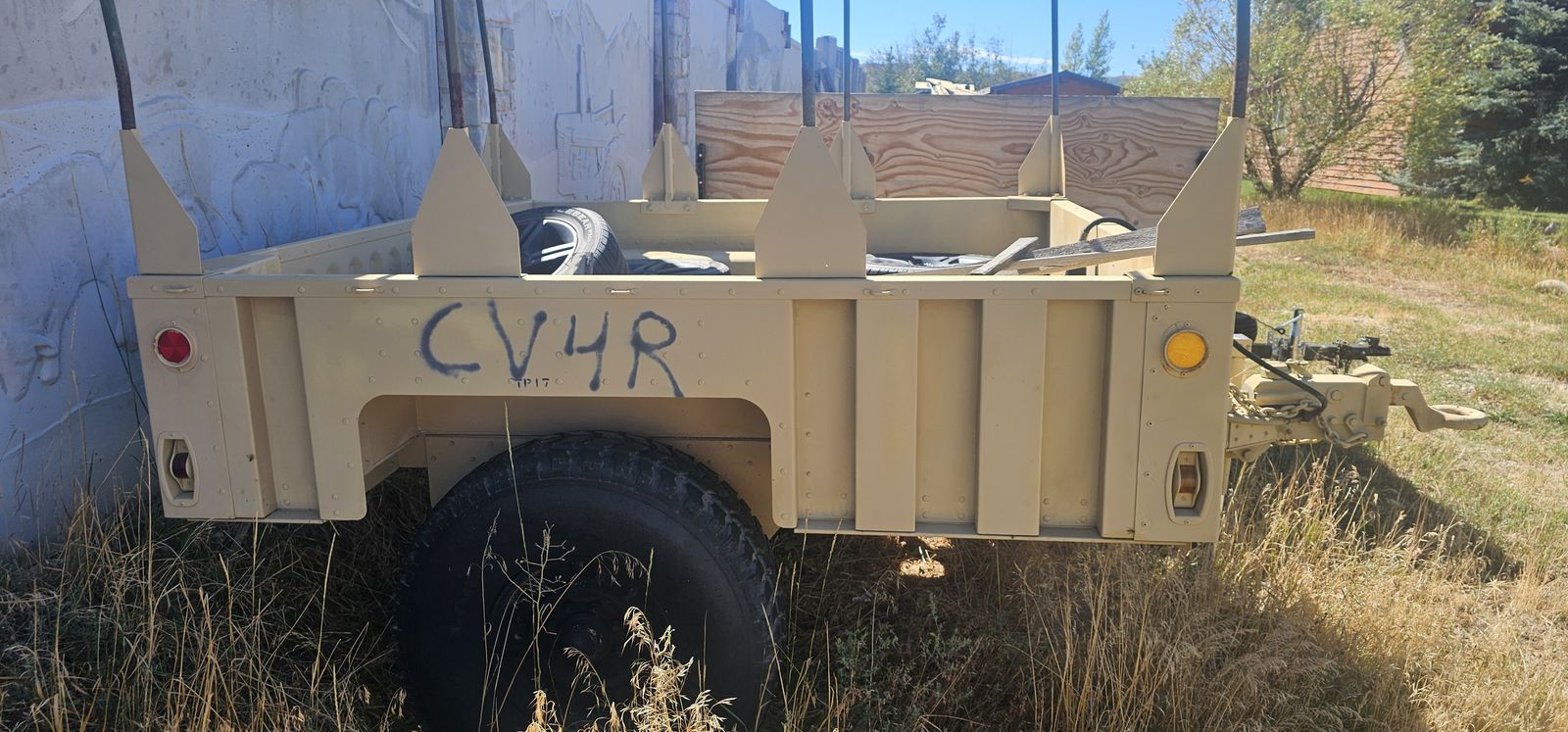 The trailer is a matching unit made for the HMMWV, it runs on the same size wheels and tires (minimizing the requirement for spares). It comes with the overhead bars to add canvas or our plan was an overland pop out tent. It has landing gear front and rear to make it stable without being hitched up. It has a built in hydraulic brake system as well as dual hand brakes for moving around manually. It even shares the same tail lights as the HMMWV and plugs right in.