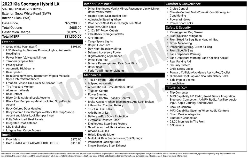 Snow White Pearl 2023 Kia Sportage Hybrid LX AWD 6-Speed Automatic 1.6L Turbo GDI 4-Cylinder 1.6L Turbo GDI 4-Cylinder.