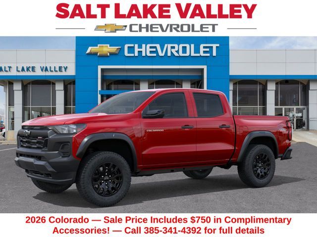 Recent Arrival! Discover the new Chevrolet Colorado at Salt Lake Valley Chevrolet in Salt Lake City! With bold design, modern technology, and reliable performance, Chevrolet makes every drive exciting. Whether it’s city streets or canyon roads, the Colorado is ready for anything. Call us today at 801-969-8221 to schedule a time to see it! --- 2026 Chevrolet Colorado Radiant Red Tintcoat 2.7L I4 Turbocharged DOHC 16V LEV3-ULEV50 310hp --- Final price excludes tax, tag, title, documentation fees, dealer-installed options, and any market-based pricing adjustments. Financing through GM Financial is required for all discounts to apply. Special finance offers may not be combined with certain factory incentives. While we strive for accuracy, errors may occur—please verify all information with a sales representative. For the most accurate pricing, call (801) 969-8221 or visit us in person. Prices and payments are subject to change based on manufacturer incentives. - Price includes - $500 - Chevrolet Consumer Cash Program - Price includes $1,500 Trade-In Allowance for customers trading a 2019 or newer passenger car or truck with under 80,000 miles toward a new 2025–2026 Chevrolet. Branded or salvage title vehicles do not qualify. Some restrictions apply. See dealer for details.