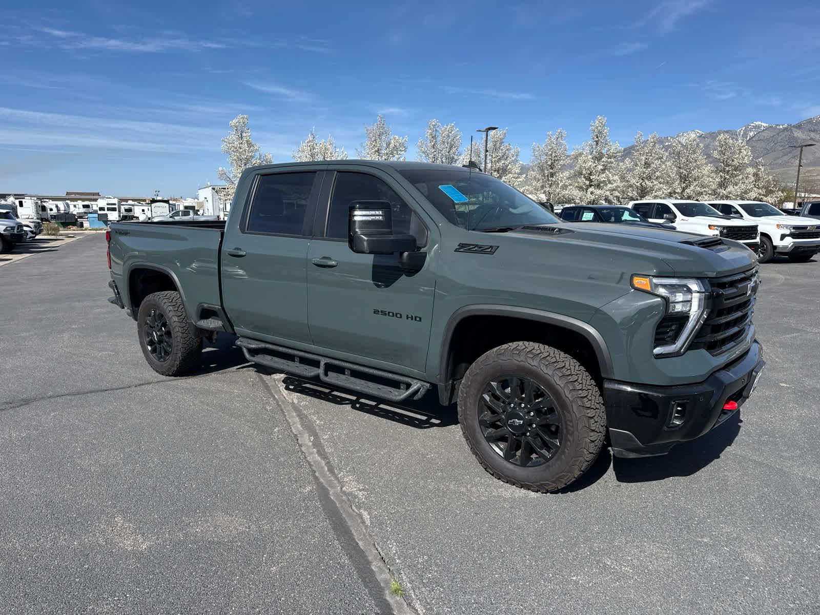 B20-Diesel compatible, (470 hp [350.5 kW] @ 2800 rpm, 975 lb-ft of torque [1322 Nm] @ 1600 rpm), Includes black grille bar with Chevy Black Bow Tie, Black grille inserts, (SRI) 20 High gloss Black painted wheels, (VB5) High Gloss Black painted front bumper, (VT5) High Gloss Black painted rear bumper, (UGA) Red Tow Hooks, (QFG) LT275/65R20 BF Goodrich off-road tires, Black skid plate, Black badging, Black bowtie on horn pad, (DP6) High Gloss Black mirror caps, Black hood vent surround, and (CGN) Chevytec spray-on bedliner. Includes high-intensity LED headlamps and (DWI) trailer mirrors. includes (UD5) Front and Rear Park Assist, (UKV) Trailer Side Blind Zone Alert, (UFG) Rear Cross Traffic Alert, (UV2) HD Surround Vision, (UVN) Bed View Camera and (TRG) Trailer Camera Provisions, includes (UF2) Cargo bed LED lighting, (CJ2) dual-zone automatic climate control, (A2X) 10-way power driver seat including power lumbar, (N37) manual tilt/telescoping steering column, (T3U) LED fog lamps, includes (BTV) Remote Start, (UTJ) Theft Deterrent System and (C49) rear-window defogger, includes (Z71) Off-Road suspension with off-road tuned twin tube Rancho shocks, (JHD) Hill Descent Control and (NZZ) skid plates (transfer case and oil pan) Includes (QXT) LT265/70R17 all-terrain, blackwall tires and molded in color Black grille. lower convex mirrors, turn signal indicators, puddle lamps, (U12) perimeter lighting, auxiliary lighting, power folding/manual extending (extends 3.31 [84.25mm]) Includes (DD8) auto-dimming rearview mirror.), includes (KA1) Heated driver and passenger seats and (KI3) Heated steering wheel, with Google built-in compatibility (select service plan required, terms and limitations apply) including navigation capability, 13.4 diagonal HD color touchscreen, includes multi-touch display, AM/FM stereo, Bluetooth® streaming audio for music and most phones; featuring Wireless Apple CarPlay® and Wireless Android Auto® capability for compatible phones, advanced voice recognition, in-vehicle apps, personalized profiles for infotainment and vehicle settings (STD), TRANSMISSION, ALLISON 10-SPEED AUTOMATIC.