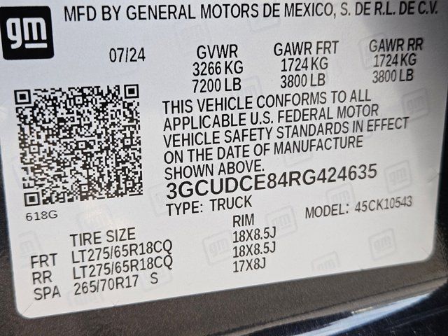 DARK ASH METALLIC,TIRE SPARE 265/70R17SL ALL-SEASON BLACKWALL (STD),ENGINE DURAMAX 3.0L TURBO-DIESEL I6 (305 hp [227 kW] @ 3750 rpm 495 lb-ft of torque [671 Nm] @ 2750 rpm) (Includes (KW5) 220-amp alternator and (K05) engine block heater.),ENGINE BLOCK HEATER,WHEELS 18 X 8.5 (45.7 CM X 21.6 CM) HIGH GLOSS BLACK PAINTED ALUMINUM (STD),SEATS FRONT 40/20/40 SPLIT-BENCH with covered armrest storage and under-seat storage (lockable) (STD),TRAILER BRAKE CONTROLLER INTEGRATED,GVWR 7200 LBS. (3266 KG),LICENSE PLATE KIT FRONT,AUDIO SYSTEM CHEVROLET INFOTAINMENT 3 SYSTEM 7 diagonal HD color touchscreen AM/FM stereo Bluetooth audio streaming for 2 active devices voice command pass-through to phone Wireless Apple CarPlay and Wireless Android Auto compatibility (STD),CUSTOM TRAIL BOSS PREFERRED EQUIPMENT GROUP includes standard equipment,STEERING COLUMN LOCK ELECTRICAL,REAR AXLE 3.23 RATIO,WHEELHOUSE LINERS REAR,TIRES LT275/65R18C BLACKWALL GOODYEAR WRANGLER TERRITORY MT (STD),TRANSMISSION 10-SPEED AUTOMATIC ELECTRONICALLY CONTROLLED with overdrive and tow/haul mode. Includes Cruise Grade Braking and Powertrain Grade Braking,EXHAUST DUAL WITH POLISHED OUTLETS,JET BLACK CLOTH SEAT TRIM,CHEVYTEC SPRAY-ON BEDLINER BLACK (does not include spray-on liner on tailgate due to Black composite inner panel),Tow Hitch,Lane Departure Warning,Lane Keeping Assist,Front Collision Mitigation,Front Collision Warning,Automatic Highbeams,Turbocharged,Keyless Start,Locking/Limited Slip Differential,Four Wheel Drive,Tow Hooks,Power Steering,ABS,4-Wheel Disc Brakes,Aluminum Wheels,Tires - Front All-Terrain,Tires - Rear All-Terrain,Tires - Front All-Season,Tires - Rear All-Season,Daytime Running Lights,Automatic Highbeams,Heated Mirrors,Power Mirror(s),Privacy Glass,AM/FM Stereo,MP3 Capability,Bluetooth Connection,Auxiliary Audio Input,Smart Device Integration,Satellite Radio,Requires Subscription,Bluetooth Connection,Smart Device Integration,Bluetooth Connection,WiFi Hotspot,Split Bench Seat,Cloth Seats,Power Driver Seat,Driver Adjustable Lumbar,Pass-Through Rear Seat,Rear Bench Seat,Floor Mats,Floor Mats,Adjustable Steering Wheel,Power Windows,Power Windows,Power Door Locks,Keyless Entry,Power Door Locks,Remote Engine Start,Cruise Control,Security System,Power Outlet,MP3 Capability,Auxiliary Audio Input,A/C,A/C,Rear A/C,Rear Defrost,Front Collision Mitigation,Front Collision Warning,Front Collision Mitigation,Traction Control,Stability Control,Daytime Running Lights,Driver Air Bag,Passenger Air Bag,Front Side Air Bag,Front Head Air Bag,Rear Head Air Bag,Passenger Air Bag Sensor,Telematics,Requires Subscription,Back-Up Camera,Lane Departure Warning,Lane Keeping Assist,Front Collision Warning,Driver Restriction Features,Tire Pressure Monitor