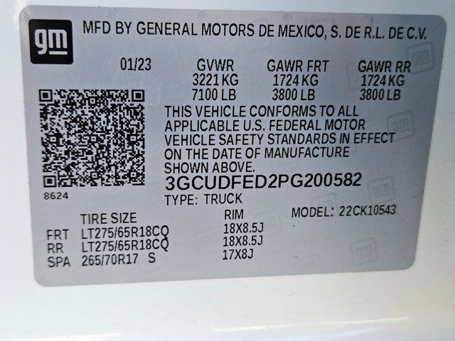GVWR 7100 LBS. (3221 KG),USB PORTS 2 CHARGE/DATA PORTS LOCATED INSIDE CENTER CONSOLE,TIRE SPARE 265/70R17SL ALL-SEASON BLACKWALL (STD),UNIVERSAL HOME REMOTE,SUMMIT WHITE,COOLING EXTERNAL ENGINE OIL COOLER,WHEELS 18 X 8.5 (45.7 CM X 21.6 CM) HIGH GLOSS BLACK PAINTED ALUMINUM (STD),ALTERNATOR 170 AMPS,TRAILER BRAKE CONTROLLER INTEGRATED,LICENSE PLATE KIT FRONT,CONVENIENCE PACKAGE II includes (UG1) Universal Home Remote (A48) rear sliding power window (PZ8) Hitch Guidance with Hitch View (JL1) Trailer brake controller and (UET) Trailering App Includes (UQA) Bose Premium Sound System.,BOSE SOUND SYSTEM PREMIUM 7-SPEAKER SYSTEM with Richbass woofer,TRANSMISSION 10-SPEED AUTOMATIC with Electronic Transmission Range Selector (ETRS) electronically controlled with overdrive tow/haul mode and steering column paddle shifters. Includes Cruise Grade Braking and Powertrain Grade Braking,NOT EQUIPPED WITH STEERING COLUMN LOCK SEE DEALER FOR DETAILS,REAR AXLE 3.23 RATIO,LT TRAIL BOSS PREFERRED EQUIPMENT GROUP includes standard equipment,WINDOW POWER REAR SLIDING with rear defogger,SEATS FRONT BUCKET with center console (Includes (EPH) Electronic Transmission Range Selector (console mounted).,TIRES LT275/65R18C BLACKWALL GOODYEAR WRANGLER DURATRAC MT (STD),HITCH GUIDANCE WITH HITCH VIEW,SHIFTER ELECTRONIC TRANSMISSION RANGE SELECTOR includes steering column paddle shifters,COOLING AUXILIARY EXTERNAL TRANSMISSION OIL COOLER,EXHAUST DUAL WITH POLISHED OUTLETS,JET BLACK CLOTH SEAT TRIM,ENGINE 5.3L ECOTEC3 V8 (355 hp [265 kW] @ 5600 rpm 383 lb-ft of torque [518 Nm] @ 4100 rpm); featuring available Dynamic Fuel Management that enables the engine to operate in 17 different patterns between 2 and 8 cylinders depending on demand to optimize power delivery and efficiency Includes (N10) dual exhaust.),CENTER CONSOLE FLOOR-MOUNTED with cup holders Wireless Charging power cord management hanging file folder capability; includes removable storage tray Includes (EPH) Electronic Transmission Range Selector (console mounted).),AUDIO SYSTEM CHEVROLET INFOTAINMENT 3 PREMIUM SYSTEM with Google built-in 13.4 diagonal HD color touchscreen includes multi-touch display AM/FM stereo Bluetooth streaming audio for music and most phones; featuring wireless Android Auto and Apple CarPlay capability for compatible phones advanced voice recognition in-vehicle apps personalized profiles for infotainment and vehicle settings (STD),WIRELESS CHARGING Beginning October 26 2022 through November 20 2022 certain vehicles will be forced to include (00C) Not Equipped with Wireless Charging which removes Wireless Charging. See dealer for details or the window label for the features on a specific vehicle.),TRAILERING APP,Tow Hitch,Lane Departure Warning,Lane Keeping Assist,Front Collision Mitigation,Front Collision Warning,Automatic Highbeams,Climate Control,Multi-Zone A/C,A/C,Security System,Rear Defrost,Keyless Entry,Power Door Locks,Power Driver Seat,Heated Front Seat(s),Driver Adjustable Lumbar,Remote Engine Start,Keyless Start,Heated Steering Wheel,High Output,Keyless Start,Locking/Limited Slip Differential,Four Wheel Drive,Tow Hooks,Power Steering,ABS,4-Wheel Disc Brakes,Aluminum Wheels,Tires - Front On/Off Road,Tires - Rear On/Off Road,Tires - Front All-Season,Tires - Rear All-Season,Daytime Running Lights,LED Headlights,Automatic Highbeams,Fog Lamps,Heated Mirrors,Power Mirror(s),Privacy Glass,AM/FM Stereo,MP3 Capability,Bluetooth Connection,Auxiliary Audio Input,Smart Device Integration,Satellite Radio,Requires Subscription,Navigation System,Satellite Radio,Telematics,Requires Subscription,Bluetooth Connection,Smart Device Integration,Bluetooth Connection,WiFi Hotspot,Split Bench Seat,Cloth Seats,Power Driver Seat,Driver Adjustable Lumbar,Heated Front Seat(s),Pass-Through Rear Seat,Rear Bench Seat,Floor Mats,Heated Steering Wheel,Steering Wheel Audio Controls,Adjustable Steering Wheel,Power Windows,Power Windows,Power Door Locks,Remote Engine Start,Keyless Entry,Power Door Locks,Keyless Start,Cruise Control,Security System,MP3 Capability,Auxiliary Audio Input,Climate Control,Multi-Zone A/C,A/C,A/C,Rear A/C,Rear Defrost,Front Collision Mitigation,Front Collision Warning,Front Collision Mitigation,Traction Control,Stability Control,Daytime Running Lights,Driver Air Bag,Passenger Air Bag,Front Side Air Bag,Front Head Air Bag,Rear Head Air Bag,Passenger Air Bag Sensor,Telematics,Requires Subscription,Back-Up Camera,Lane Departure Warning,Lane Keeping Assist,Front Collision Warning,Driver Restriction Features,Tire Pressure Monitor
