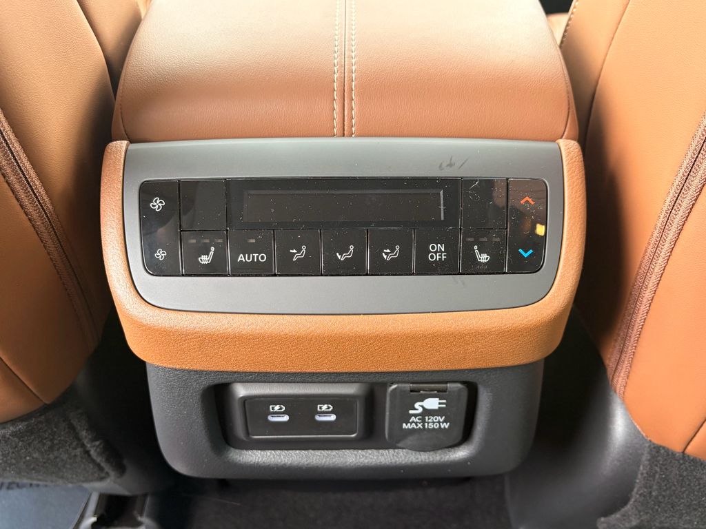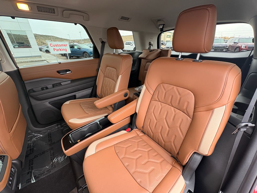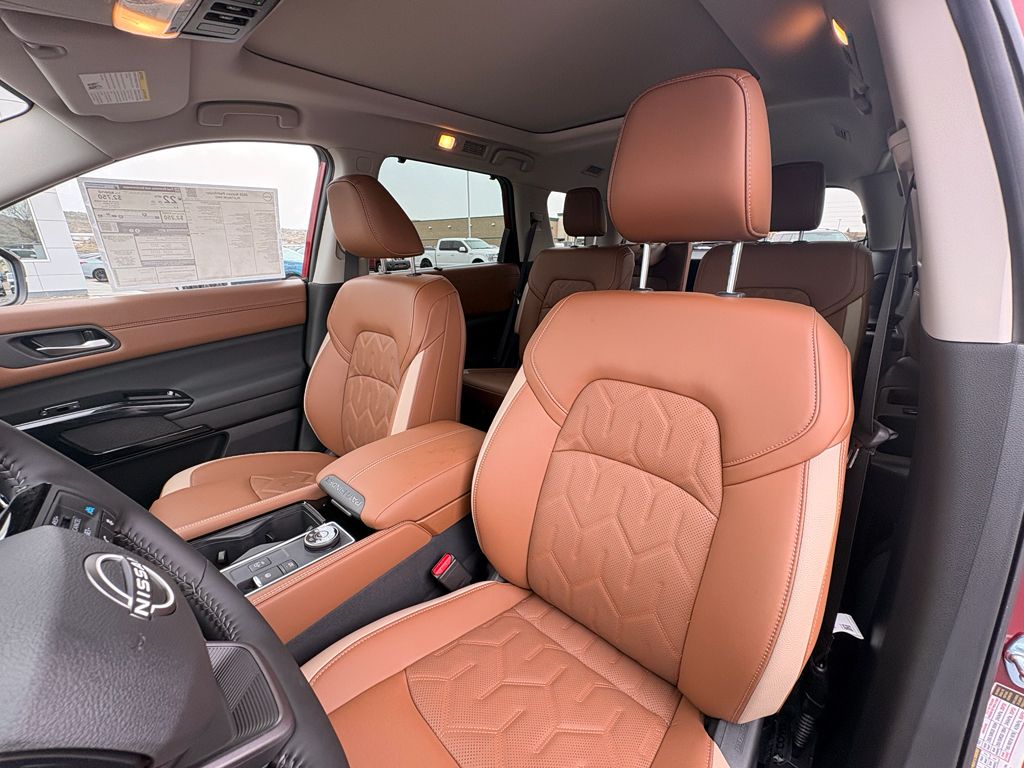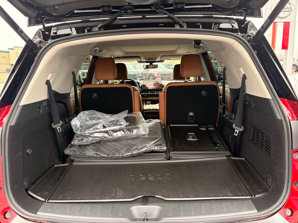 Cargo Package: Cargo Area Protector; Cargo Net; First Aid,Platinum Captain Chairs Package: 2nd-Row Captain Chairs; 2nd-Row Removable Centre Console,Premium Paint and 2-Tone Roof,Cross Bars,Captain's Chairs Carpeted Floor Mats,4-Piece Black Splash Guards,NissanConnect featuring Apple CarPlay and Android Auto smart device wireless mirroring,ProPILOT Assist hands-on cruise control,Automatic Emergency Braking (AEB) forward collision mitigation,Automatic Emergency Braking with Pedestrian Detection (P-AEB),NissanConnect with Wi-Fi Hotspot mobile hotspot internet access,RearView Monitor rear mounted camera,Intelligent Lane Intervention (I-LI),Intelligent Blind Spot Intervention (I-BSI),Rear Automatic Braking (RAB) collision mitigation,Intelligent Cruise Control (ICC) w/Full Speed Range and Hold,Head-up display,Brake assist system,Cruise control with steering wheel mounted controls,Power liftgate rear cargo door,Ventilated driver and front passenger seats,Keyfob remote start,Heated steering wheel,Heated driver and front passenger seats,Heated rear seats,Semi-Aniline leather front seat upholstery,Primary monitor touchscreen,Fixed third-row seats,First and second-row sliding and tilting glass sunroof with express open/close activation sunshade,Driver seat power reclining, lumbar support, cushion tilt, fore/aft control and height adjustable control,Intelligent 4x4 (I-4x4) part and full-time 4WD,3.5L V-6 gasoline direct injection, DOHC, variable valve control, regular unleaded, engine with 284HP,3.5L V-6 DOHC,Front wireless smart device charging,Google Assistant built-in virtual assistant,Intelligent Driver Alertness (I-DA),NissanConnect Services restricted driving mode/alerts,Front cross traffic mitigation,Intelligent Key with hands-free access and push button start,Keyfob window control,HD Enhanced Intelligent Around View Monitor aerial view camera,Invisible Hood View ground view camera,Smart device remote start,Push-button,Automatic brake hold,Bluetooth wireless audio streaming,Performance data recorder with video,Gauge cluster display size: 12.30,Proximity cargo area access release,Front mounted camera,Right side camera,Left side camera,Dual-zone front climate control,Rear climate control system with separate controls,Full gauge cluster screen,High Beam Assist (HBA) auto high-beam headlights
