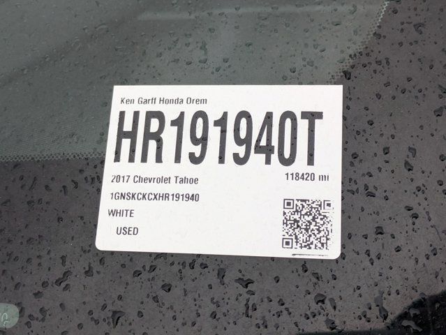 Ken Garff Honda is honored to offer this good-looking 2017 Chevrolet Tahoe Premier in Iridescent Pearl Tricoat.Value Certified, 4WD, Jet Black Leather, 10 Speakers, 1st & 2nd Row Color-Keyed Carpeted Floor Mats, 3.08 Rear Axle Ratio, 3rd Row 60/40 Power Fold Split-Bench, 3rd row seats: split-bench, 4-Wheel Antilock Disc Brakes w/Brake Assist, 4-Wheel Disc Brakes, 5 12-Volt Auxiliary Power Outlets, 6-Way Power Front Passenger Seat Adjuster, ABS brakes, Adaptive suspension, Adjustable pedals, Air Conditioning, All-Weather Floor Mats, Alloy wheels, AM/FM radio: SiriusXM, Apple CarPlay/Android Auto, Auto High-beam Headlights, Auto-dimming door mirrors, Auto-Dimming Inside Rear-View Mirror, Auto-dimming Rear-View mirror, Automatic temperature control, Black Assist Steps w/Chrome Accent Strip, Body Security Content Theft Protection Package, Bodyside moldings, Bose Centerpoint Premium 10-Speaker Surround Sound, Brake assist, Bumpers: body-color, Cargo Net, Cargo Security Shade (LPO), CD player, Color-Keyed Carpeting Floor Covering, Compass, Delay-off headlights, Driver door bin, Driver Inboard & Front Passenger Airbags, Driver vanity mirror, Dual front impact airbags, Dual front side impact airbags, Electronic Cruise Control w/Set & Resume Speed, Electronic Stability Control, Emergency communication system: OnStar Guidance, Enhanced Driver Alert Package (Y86), Enhanced Driver Information Center, Exterior Parking Camera Rear, Floor Console, Fog Lamps, Forward Collision Alert Sensor Indicator, Front & Rear Parking Assist, Front anti-roll bar, Front Bucket Seats, Front Center Armrest, Front dual zone A/C, Front fog lights, Front Heated Reclining Bucket Seats, Front reading lights, Front wheel independent suspension, Fully automatic headlights, Garage door transmitter, Hands Free Power Liftgate, Head-Up Display, Heated & Vented Driver & Front Passenger Seats, Heated 2nd Row Seats, Heated door mirrors, Heated front seats, Heated Leather Wrapped Steering Wheel, Heated rear seats, Heated steering wheel, High-Intensity Discharge Headlights, Illuminated entry, IntelliBeam Headlamps, Lane Keep Assist, License Plate Front Mounting Package, Low Speed Forward Automatic Braking, Low tire pressure warning, Magnetic Ride Control Suspension Package, Memory seat, Memory Settings, Molded Splash Guards, Navigation System, NavTraffic, Occupant sensing airbag, OnStar Basic Plan For 5 Years, Outside temperature display, Overhead airbag, Overhead console, Panic alarm, Passenger door bin, Passenger vanity mirror, Passive Entry System, Pedal memory, Perforated Leather-Appointed Seat Trim, Power door mirrors, Power driver seat, Power Liftgate, Power passenger seat, Power Release 2nd Row Bucket Seats, Power steering, Power Tilt & Telescopic Steering Column, Power windows, Power-Adjustable Accelerator & Brake Pedals, Power-Folding Heated Outside Mirrors, Preferred Equipment Group 1LZ, Premium audio system: Chevrolet MyLink, Push Button Keyless Start, Radio: Chevrolet MyLink w/Nav/AM/FM Stereo, Rain sensing wipers, Rear air conditioning, Rear anti-roll bar, Rear Cross-Traffic Alert, Rear reading lights, Rear window defroster, Rear window wiper, Remote Keyless Entry, Remote keyless entry, Remote Vehicle Start, Roof rack: rails only, Roof-Mounted Luggage Rack Side Rails, Security system, Side Blind Zone Alert w/Lane Change Alert, Single-Slot CD/MP3 Player, SiriusXM Satellite Radio, Speed control, Speed-sensing steering, Split folding rear seat, Spoiler, Steering wheel memory, Steering wheel mounted audio controls, Tachometer, Telescoping steering wheel, Theft-Deterrent Alarm System, Tilt steering wheel, Traction control, Trip computer, Turn signal indicator mirrors, Universal Home Remote, Variably intermittent wipers, Vehicle Inclination Sensor, Vehicle Interior Movement Sensor, Ventilated front seats, Voltmeter, Wheels: 20 x 9 Polished-Aluminum, Wireless Charging, 4WD, Jet Black Leather.Awa