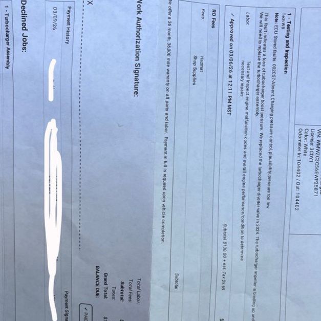The turbo needs to be replaced. Aside from that, the car has been solid and well cared for. Oil recently changed and no other issues besides the turbo (see last pic for mechanic bill dated 03/06/26)